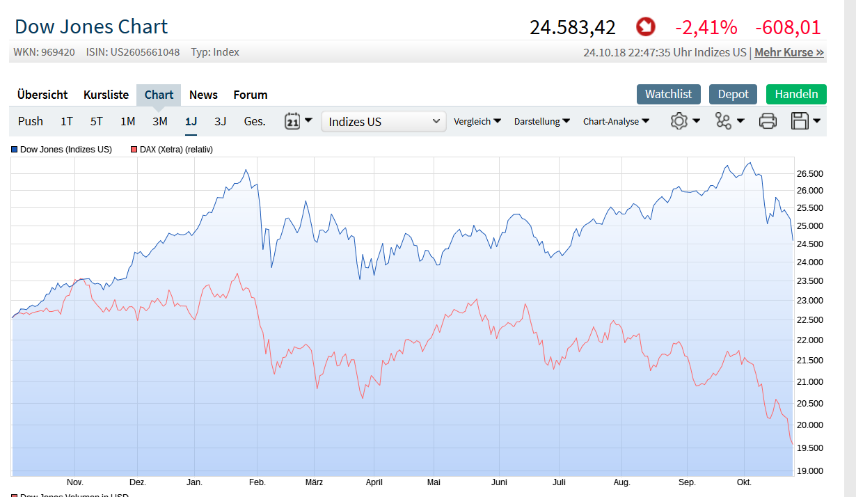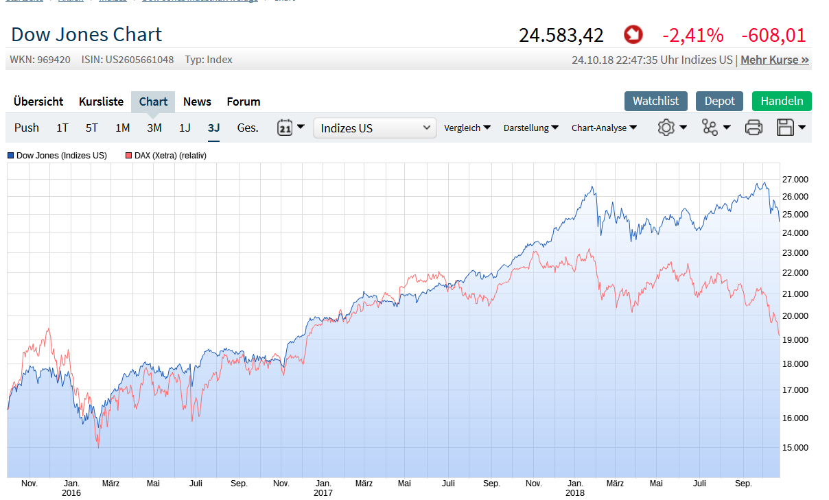 weshalb der DAX im Vergleich zum DOW so schlecht performt hat? Haben die Amis die besseren Produkte? Ich sehe deutsche Firmen mittlerweile einer Politik gegenüber stehen, die sich scheinbar zum Ziel gesetzt hat, Deutschland zu deindustrialisieren. Die Hysterie gegen den Diesel knüpft beinahe nahtlos an die Hysterie gegenüber der Kernkraft und gegenüber der Kohle an. Anstatt eine kontinuierliche Entwicklung bestehender Strukturen zu unterstützen, wird eine Kernkompetenz nach der anderen zerschlagen und vom "Exportweltmeister" geschwafelt. (der seine Produkte über Target 2 verschenkt bzw. selbst bezahlt)