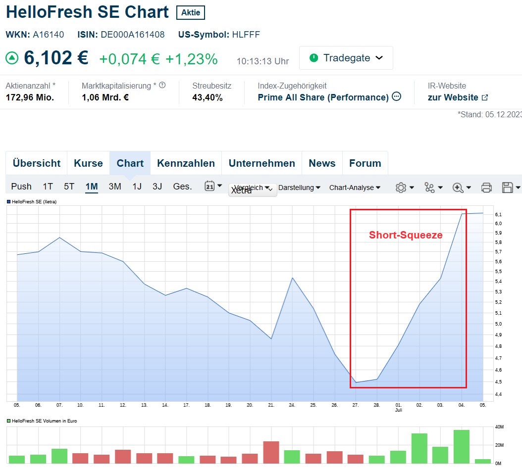 Die Short-Quote ist bei Schaeffler mit 1,78% nicht übermäßig hoch. Beim Spitzenreiter Hellofresh liegt sie bei 16%. Deshalb schießt Hellofresh übrigens auch immer wieder mal sprunghaft hoch (unten). Da reichen nur ein paar zweifelhafte "gute News".