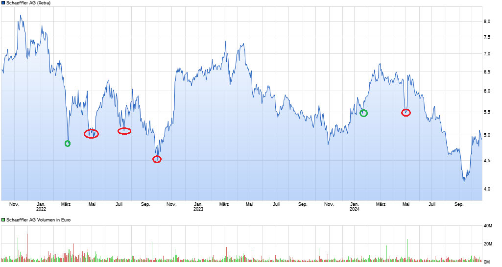 D.h. wenn die News bereits gekommen wäre, als sich die Schaeffler-Aktie noch im starken Downtrend seit Mai befand, hätte sie den Kurs eher um 6% gedrückt, als ihn um 6% zu heben. Dann hätten nämlich die Shortseller ihre Posis weiter vergrößert. Jetzt hingegen, im auch saisonbedingten Uptrend, führt diese News eher zur Reduzierung von Shortpositionen.