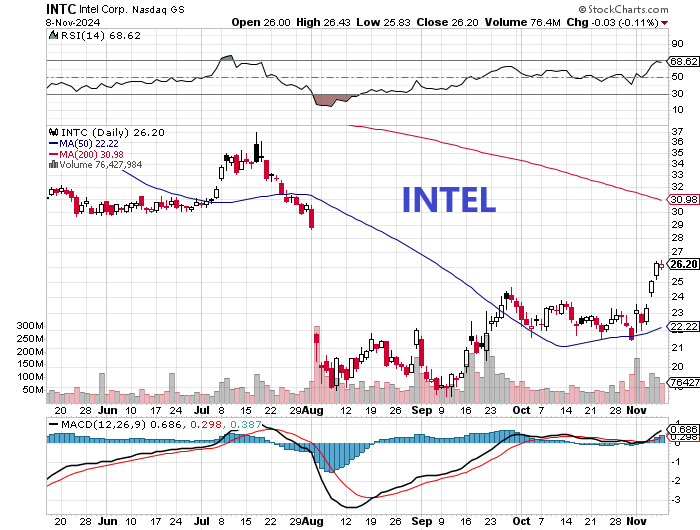 Bei Intel wurden im August Horrorzahlen gemeldet (Milliardenverluste), und es wurde die Entlassung von 15.000 Mitarbeitern angekündigt. Wegen der Verluste fiel der Intel-Kurs von 30$ auf 19$ (Chart unten). Letzte Woche gab es wieder Milliardenverluste (nun sogar 40 Mrd. an Abschreibungen), aber das Management lieferte einen besseren Ausblick. In der Folge stieg die Intel-Aktie von 21 auf 26$, wozu auch der Trump-Sieg und die damit verbundene Börseneuphorie in USA (neue ATHs) beitrug.