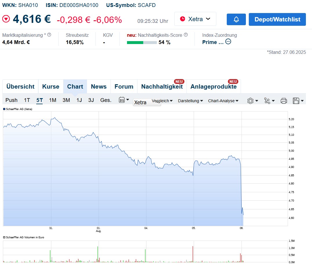 Die Aktie wurde im Vorfeld der Zahlen bis 5,20 € hochgezockt, um sie dann binnen Tagen um 13% zu crashen. Das sieht mir einmal mehr nach dem Werk von Charttradern und Shorties aus. Longies sitzen weiter auf ihren Händen und schauen den Kurzfristzockern hilflos dabei zu, wie sie den Chart weiter ruinieren und damit den Grundstein dafür legen, dass auch in den nächsten 5 Jahren nur Kurzfristzocker mit Schaeffler hohe positive Renditen erwirtschaften.