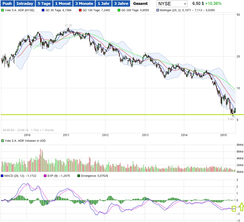 Mittellinie Billinger Band ist bei 4,8 Euro und denke es wird lange schwach bleiben ! China bleibt lange Zeit ca 7% Wachstum und für Vale wird auch nicht schnell steigen! In 5 Jahren wissen wir mehr wo Vale stehen wird! Rousseff Abgang würde Vale bestimmt steigen!?