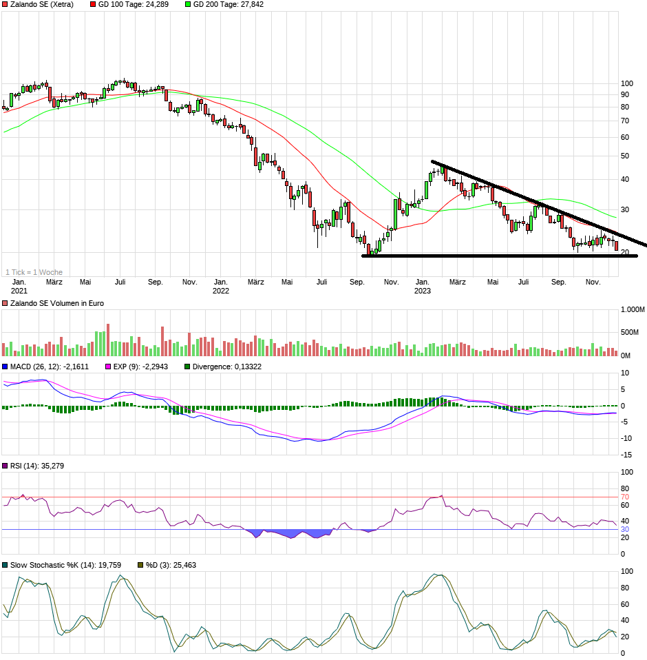Zalando habe mit dem EBIT des dritten Quartals die Erwartungen leicht übertroffen und die EBIT-Jahresprognose von 300 bis 350 Millionen Euro bekräftigt, so Analyst Adam Cochrane von der Deutschen Bank. Allerdings habe das Unternehmen seine Prognosen zu Bruttowarenwert und Umsatz abermals gesenkt. Das lasse vermuten, dass sich das Geschäft im Oktober nach einem schwachen September allenfalls unwesentlich erholt habe. Positiv sei indessen, dass die Erwartungen an den Umsatz im vierten Quartal 2023 und das kommende Jahr zuvor schon gesunken seien. Der von Zalando genannte Prognosekorridor impliziere eine weitere Anpassung des Konsens auf einen Rückgang des Umsatzes um 1,5 bis 2 Prozent.