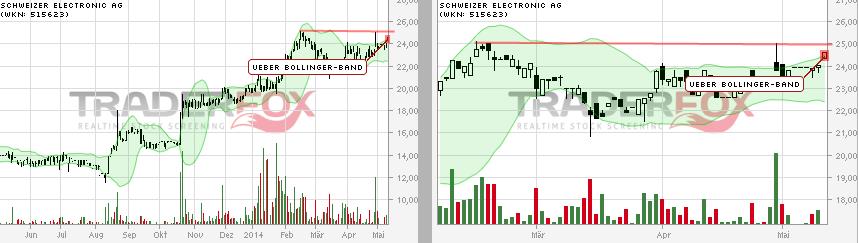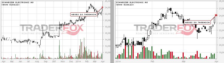 Doch es gibt auch positive Aspekte: Für 2014 haben die Schramberger ihr bislang in einer Spanne von drei bis sieben Prozent angesiedeltes Erlösplus nun am oberen Ende fixiert. Demnach sollte Schweizer Electronic für 2014 auf Umsätze von mindestens 108 Mio. Euro kommen. Für das Ergebnis stellt das Unternehmen eine "entsprechende Entwicklung" in Aussicht. Die Analysten von Montega veranschlagen das 2014er-EBIT für Schweizer Electronic jetzt auf 10,4 Mio. Euro. Das liegt zwar ganz leicht unterhalb ihrer bisherigen Schätzung. Das Kursziel haben die Nebenwerteexperten aus Hamburg dennoch bei 29 Euro belassen, was einem Potenzial von immerhin fast 42 Prozent gleichkommt. Für boersengefluester.de bietet der Small Cap auf dem aktuellen Niveau von 20,40 Euro ebenfalls weit überdurchschnittliche Chancen.