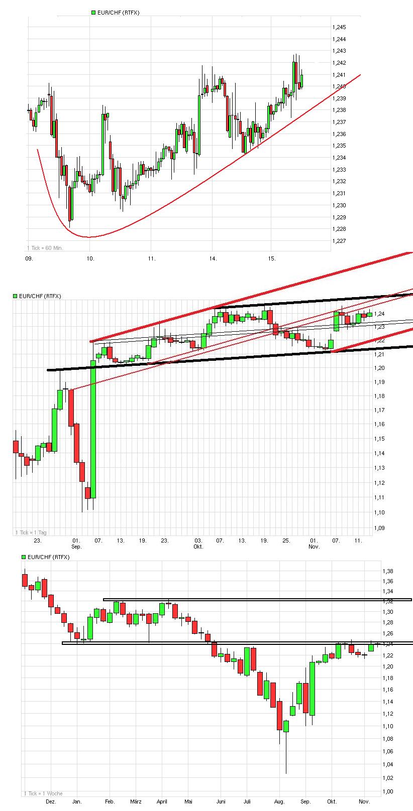 €/SFR Investoren orientieren sich scheinbar weiter lieber an der 1,25 anstatt der 1,20. Offenbar will sich kein größerer Investor zu lange von der Marke rund um die 1,25 nach unten wieder entfernen. Der kurze Rückgang vor ein paar Tagen ging wohl auf die Kappe einiger Kurzfristzocker, die naiverweise dachten die SNB erhöht direkt nach der Forderung aus der Politik schon auf 1,25. Als das nicht sofort kam, stieg diese überschaubare Klientel wieder aus. Jetzt sind wohl wieder eher Investoren auf der Kaufseite aktiv die einen etwas längeren zeitlichen Horizont mitbringen. Man kann es eigentlich als ausgemachte Sache ansehen, daß die SNB noch in diesem Jahr €/SFR auf 1,25 anheben wird. Die kollektive Forderung seitens Arbeitgeber, Arbeitnehmer, Politik und seitens der Ökonomen jüngst wird nicht ohne Wirkung bleiben. Man muß nur seitens der SNB jetzt noch eine gewisse "Schamfrist" verstreichen lassen, um so am Ende weiter sagen zu können man handelt unabhängig und nicht weil man politisch abhängig wäre. Von daher erwarte ich die nächste Anhebung der SNB in der 1. Dezemberhälfte. Aber bis dahin ist es auch nicht mehr weit. Und im März 2012 konnte die 1,30 auf die Agenda kommen. Sobald die 1,25 nachhaltig genommen würde, wäre das nächste größere Ziel aus charttechnischer Sicht die 1,32. Somit würde die Charttechnik und deren Crunch Marken der SNB in die Hände spielen bei ihren Schritten nach oben.