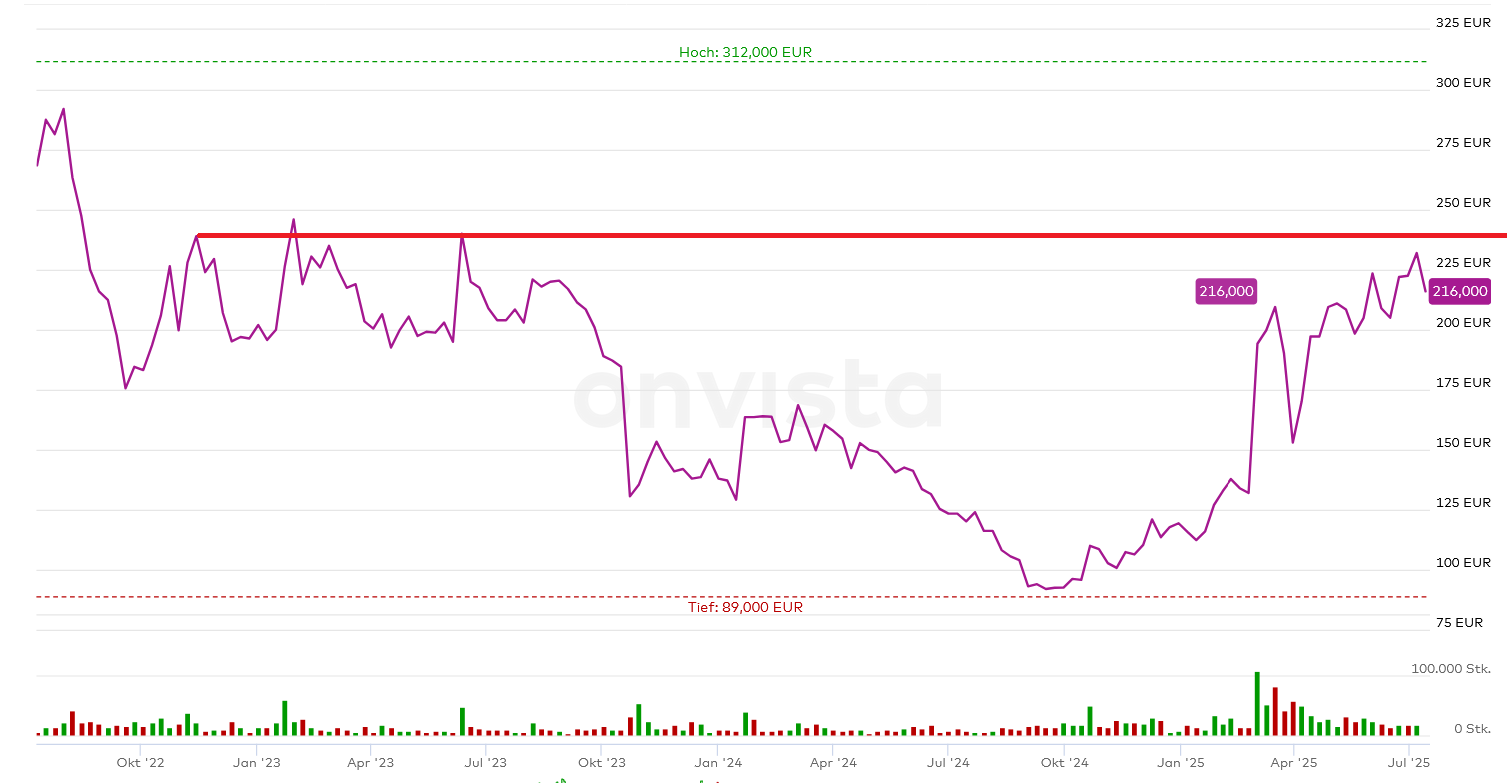 Fazit Die Prognose für das Gesamtjahr bleibt bei einem Umsatz von rund 425 Mio. EUR, einer EBIT-Marge von 9,5–11,5 % und einer EBITDA-Marge von 14,5–16,5 %. Die Auftragskonzentration im vierten Quartal könnte zwar dazu führen, dass sich einige Auslieferungen aufgrund von Budgetplanungen auf Anfang 2026 verschieben, die langfristigen Wachstumschancen scheinen jedoch intakt. Wir haben unsere mittelfristigen Schätzungen leicht angehoben, um den strukturellen Rückenwind durch höhere Verteidigungsausgaben zu berücksichtigen. Dies führt zu einem revidierten Kursziel von 190,00 EUR (alt: 180,00 EUR). Nach der jüngsten Kurskorrektur erhöhen wir unsere Bewertung von „Verkaufen“ auf „Halten“.