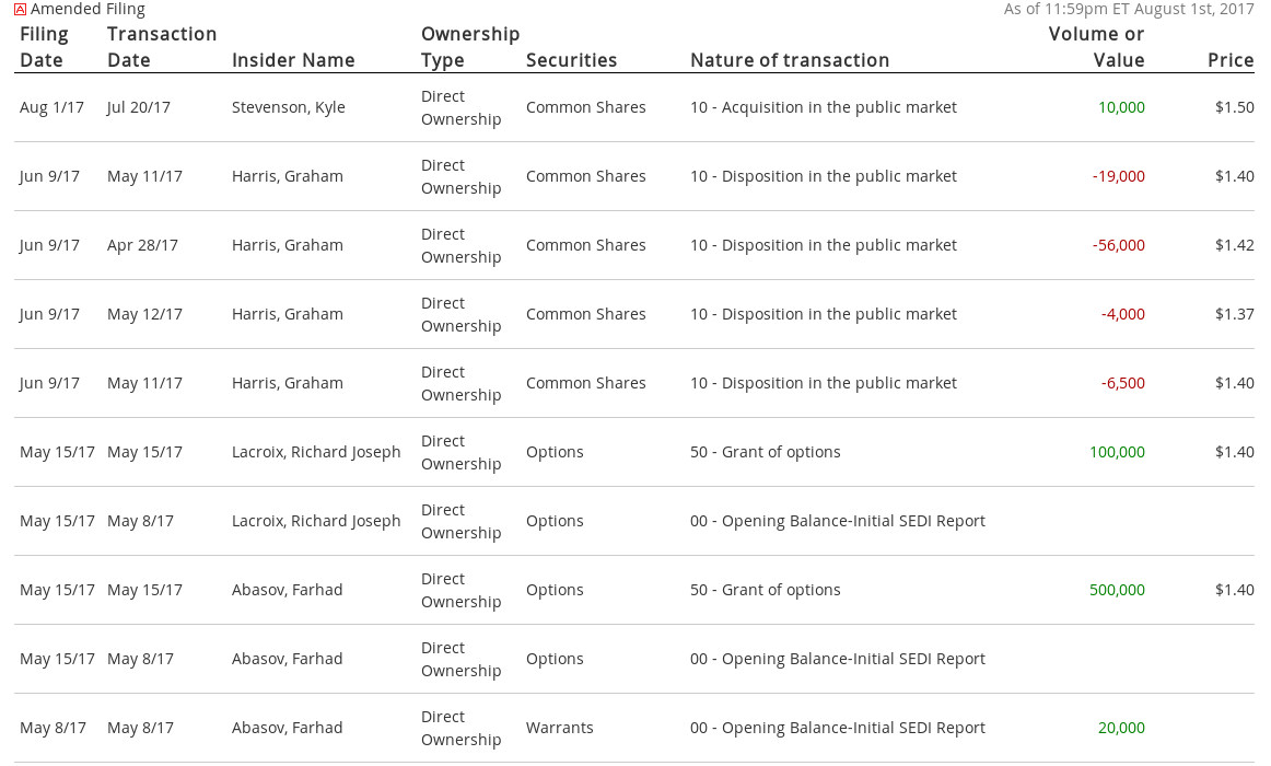 Das Unternehmen möchte auch berichten, dass drei Kreditgeber (die "Lenders"), die Nicht-Arm-Längen-Parteien der Gesellschaft sind, ausgeliehen haben (die "Darlehen") insgesamt US $ 2.000.000 (die "Darlehensfonds") an die Gesellschaft. Die Kreditgeber sind: Graham Harris, Direktor und Vorsitzende der Gesellschaft (nach US $ 900.000), Andrew Bowering, Direktor der Gesellschaft (nach US $ 900.000) und Farhad Abasov, Direktor und CEO der Gesellschaft (auf $ 200.000). Im Zusammenhang mit den Darlehen hat die Gesellschaft insgesamt 266.667 Stammaktien (die "Anteile") an die Kreditgeber als Bonusaktien für die Darlehen ausgegeben. Die Anteile tragen eine viermonatige Börsenperiode, die am 7. Dezember 2017 ausläuft. Die Darlehen haben eine Laufzeit von einem Jahr, bevor die Kreditgeber die Zahlung verlangen und einen jährlichen Zinssatz von 12% tragen können. Die Darlehen werden durch eine Garantie der Tochtergesellschaft der Gesellschaft, die ihr Pastos Grandes-Projekt hält, sowie durch ein allgemeines Sicherheitsinteresse an Vermögenswerten gesichert. Die Gesellschaft hat keine andere wesentliche Verschuldung außer Handelsverbindlichkeiten, die im ordentlichen Geschäftsverlauf entstanden sind