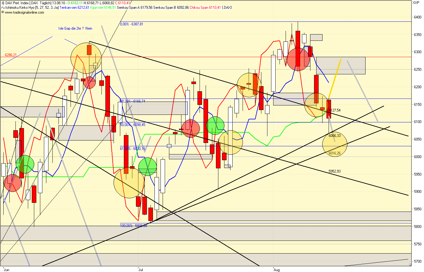 Ich rechne noch mit einem Versuch des Daxes über die 6200 zu steigen. Falls das so kommt und der Druck stark genug ist besteht sogar die Möglichkeit das das Eröffnungsgap bei 6286 geschlossen wird. Ich gehe spekulativ long bis 22 Uhr, auch wenn das Sell-Signal noch gilt. Sollte die US-Märkte heute nach 20 Uhr abend weiter fallen wird der Schein entsorgt.