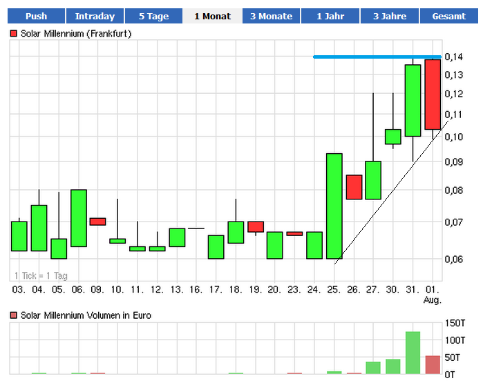 Klar es haben heute wenige verkauft(siehe Volumen unterm Chart) aber wir halten ein schönes Nivau heute nach dem Anstieg gestern.