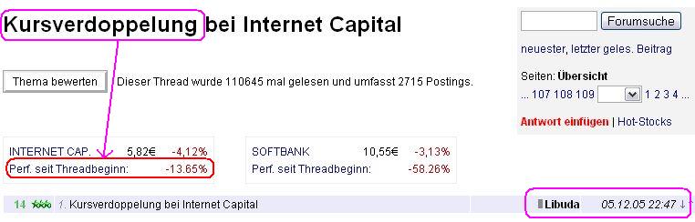 einen guten Schnit mit Mannesmann gemacht hat, aber dann kam für ihn das große Problem: Er investierte dieses Geld auf dem Höhepunkt des Internetbooms in die spätere Leiche Commerce One und sein Geld war komplett weg. Seit ich damals der Commerce One-Gemeinde auf diversen Boards empfahl "Verkauft den Schrott" ziehe ich die Commerce-One-Verzocker an wie der Rattenfänger von Hameln die Ratten. Besonders schlimm ist für diese Gemeinde, dass ich mich dann auch noch erdreistete, einen Ihrer Darlings, nämlich Internet Capital, den sie für $ 4.280 gekauft und für $3,40 verkauft hatten, für Preise zwischen $3,40 und $8,50 einzusammeln. Davon habe ich inzwischen 20.000 Stück - sie hätten, als sie gekauft haben, dafür fast 90 Millionen Dollar bezahlen müssen. Mir war nämlich aufgefallen, dass Internet Capital im Gegensatz zu Commerce One und anderen Darlings von damals keine Aufkäufe mit durch Kredite beschaftes Bargeld tätigte, sondern als Internet-Holding die Aufkäufe mit den völlig überteuerten eigenen Aktien bezahlte. Zwar sank die völlig überzockte Aktien von $4.280 auf §3.40 und steht heute bei knapp $9, aber Internet Capital überlebte wegen nicht allzu hoher Schulden, ist heute schuldenfrei, hat 200 Millionen Cash/Wertpapiere, vier Beteiligungen, die im Schnitt jede 120-150 Millionen wert sind, und ca. 8 weitere von Bedeutung, die im Schnitt 30 Millionen wert sind. Und das alles gibt es momentan für etwa 350 Millionen Marktkapitalisierung - und das macht Stöffen, Anti-Lemming und anderen New Economy-Verlierern undendlichen Frust.