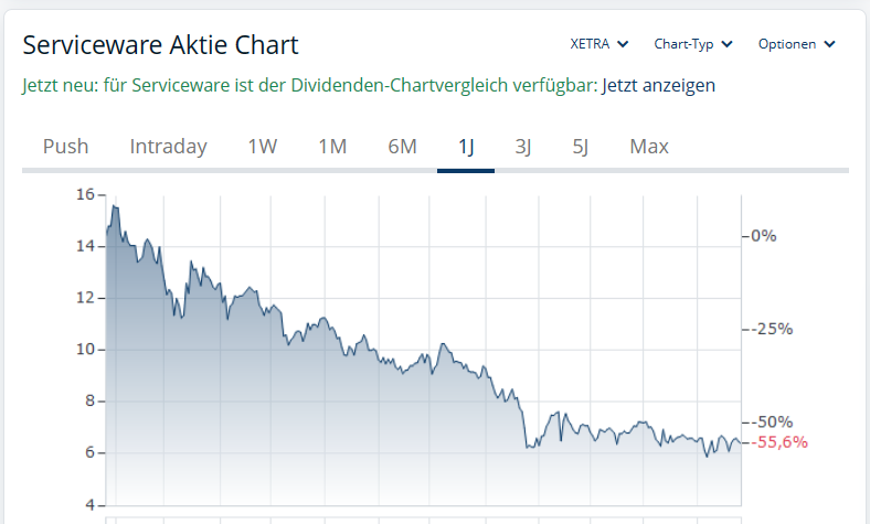 SaaS Aktien kacken nach meiner Erfahrung einfach stetig ab. Ein Change gibt es erst, wenn der Lizenzanteil nur noch einen geringen Anteil des Umsatzes ausmacht und da sind wir bei Serviceware noch weit entfernt.