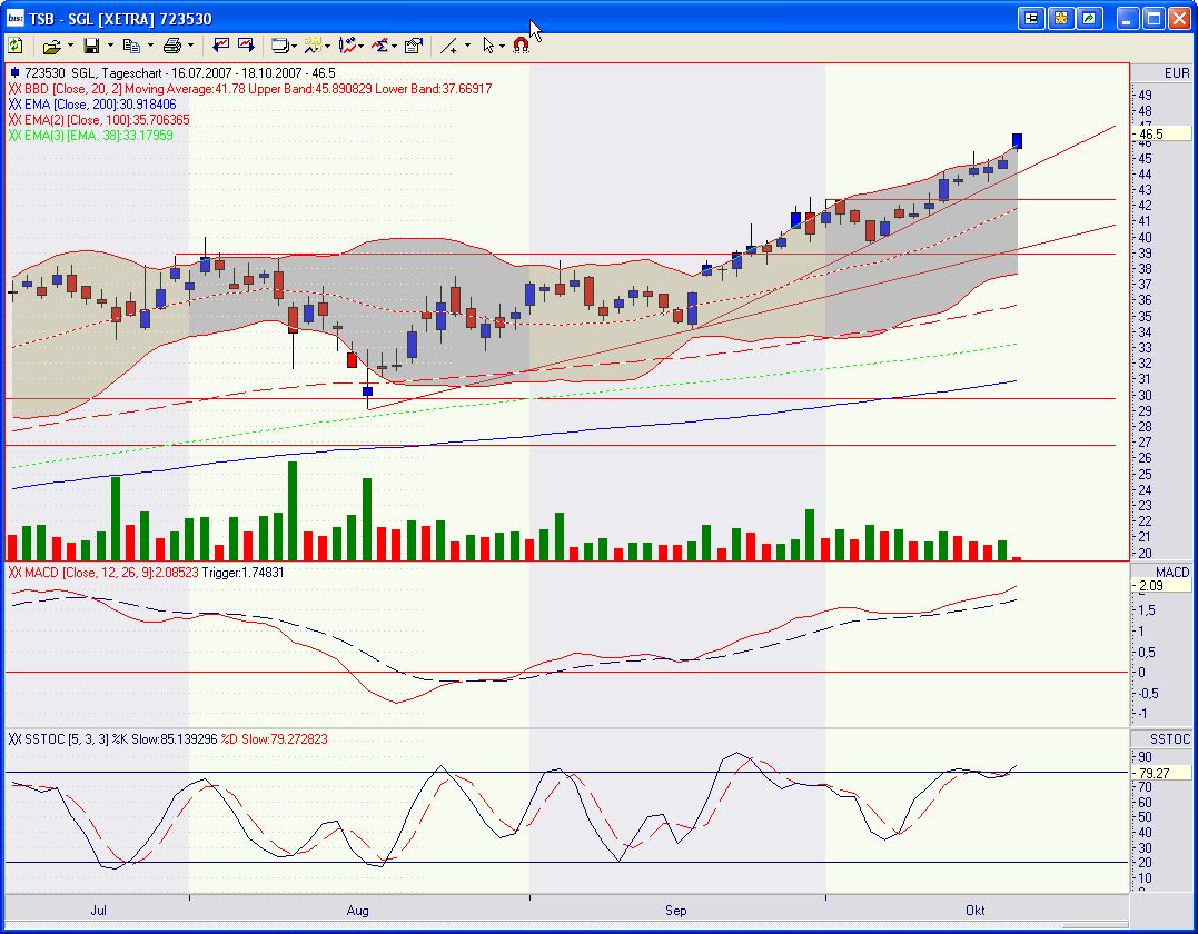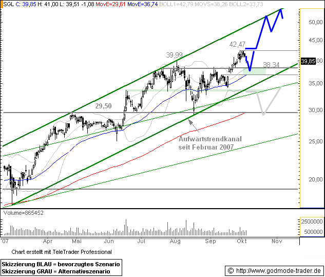 Für das Gesamtjahr 2007 bestätigt die SGL Group die zum Halbjahr angehobene Prognose. Der Konzernumsatz soll bis zu 15 % steigen. Beim EBIT wird eine Verbesserung um rund 45 % gegenüber dem EBIT des Gesamtjahres 2006 (vor Kartellaufwendungen) erwartet. Einschließlich der Einmaleffekte aus der Refinanzierung sollte das Finanzergebnis rund -70 Mio. € vor Bewertungseinflüssen aus Zins- und Währungsabsicherungs instrumenten betragen. Damit wird erwartet, dass sich Vor- und Nachsteuergewinn gegenüber dem Vorjahr mehr als verdoppeln. Hierbei wird eine Steuerquote von rund 35 % zugrunde gelegt. Aufgrund der Wachstumsstrategie, speziell im Segment Advanced Materials sowie bei Kathoden, rechnet die SGL Group für 2007 mit Investitionen in Sachanlagen in Höhe von bis zu 120 Mio. €.