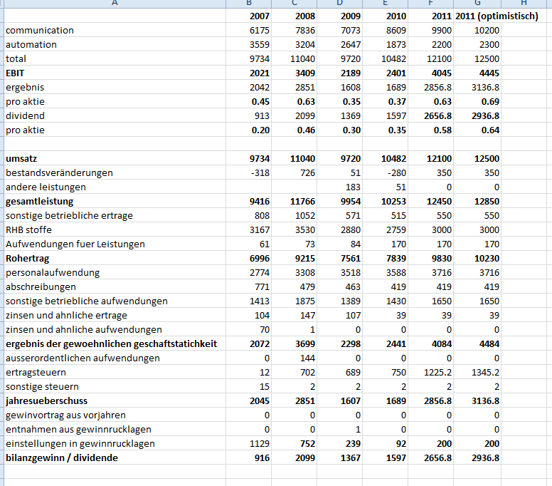 Zahlen 2011 kommen wahrscheinlich nächste Woche Freitag, und können für eine positive Kursentwicklung sorgen. 12.1 wird von SHF selber geschätzt. Wenn das konservativ war, sind 12.5 Mio drinne. Das EBIT dürfte dann bei fast 4.5 Mio liegen, und ein Jahresüberschuss von vielleicht über 3.5 Mio. Also 0.70 pro Aktie sind möglich. Vielleicht sogar 0.75. Das hängt ab von der Entwicklung der zweiten Jahreshälfte 2011. Da gab es leider nur die eine Nachricht, dass sie sich von der Automation Abteilung trennen. Über das Jahresverlauf 2011 wurde in der Nachricht nichts gemeldet.