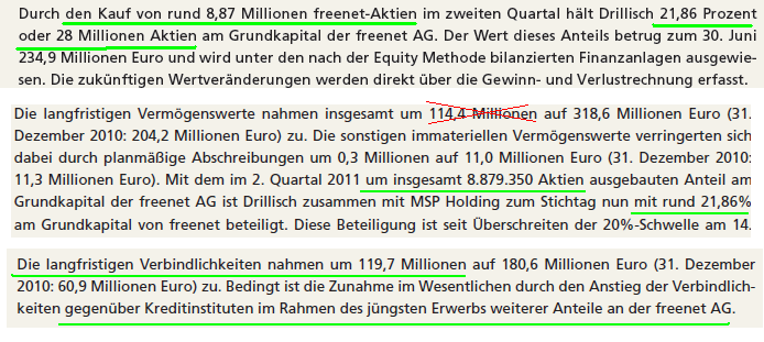 Selbst wenn ich nun mal von 5 % Zinsen auf die 180 Mio Verbindlichkeiten ausgehe, sind das9 Mio pro Jahr. Es kommen aber rund 28 Mio mal 0,80 € Dividende von Freenet