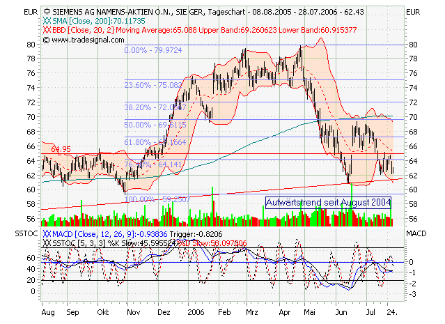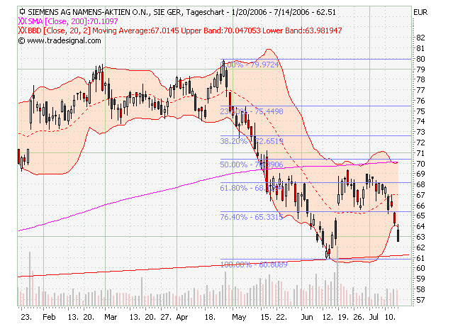 Die SIEMENS Aktie erreichte am 26.04.2006 das bisherige Jahreshoch bei 79,97 Euro. Von diesem Hoch aus fiel die Aktie steil ab. Erst am 14.06. fand die Aktie bei 60,81 Euro ein Tief. In der Abwärtsbewegung hatte die Aktie sowohl eine wichtige Unterstützung bei 68,90 als auch den Aufwärtstrend seit März 20043 gebrochen. Von dem Tief bei 60,81 Euro aus kam es zu einer zügigen Bewegung bis an den Widerstand bei 68,90 Euro. In den letzten konsolidiert die Aktie im Wesentlichen unterhalb dieser Marke seitwärts, wobei sie ein Tief bei 65,55 Euro ausgebildet hat. Bricht die Aktie nun signifkant über 68,90 Euro aus, ist nachfolgend eine mehr! wöchige Höherbewertung bis ca. 79,60 Euro zu erwarten. Fällt die Aktie aber unter 65,55 Euro zurück, wäre ein Rückfall bis 60,81 Euro zu erwarten.