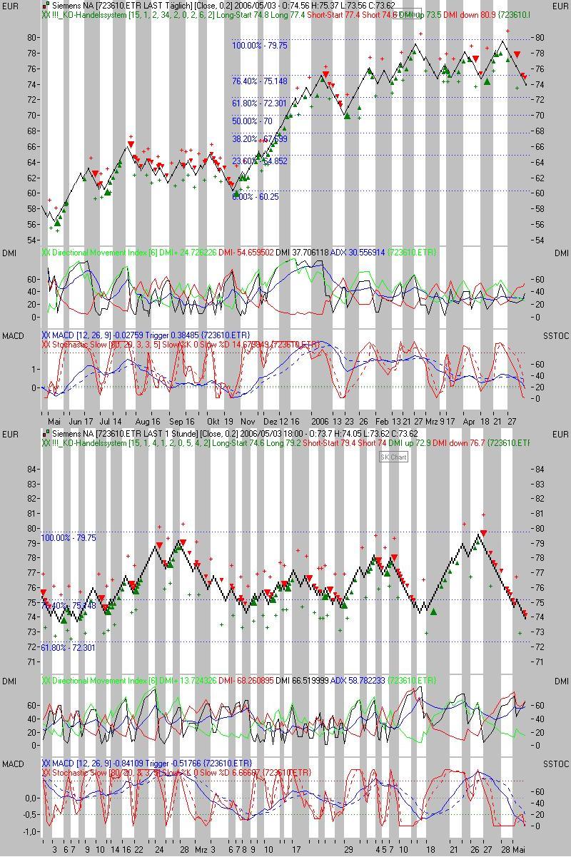 Sieht noch nicht Long aus, Shortbestätigung am 24.05.06 und DMI- Divergenz gestern (bedeutet: Kurs entwickelt sich entgegengesetzt zum Trend).