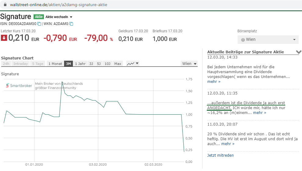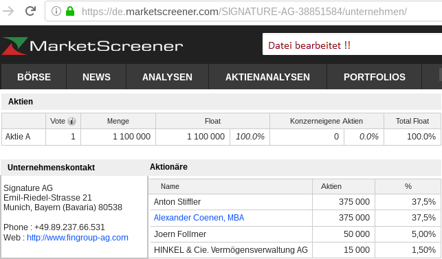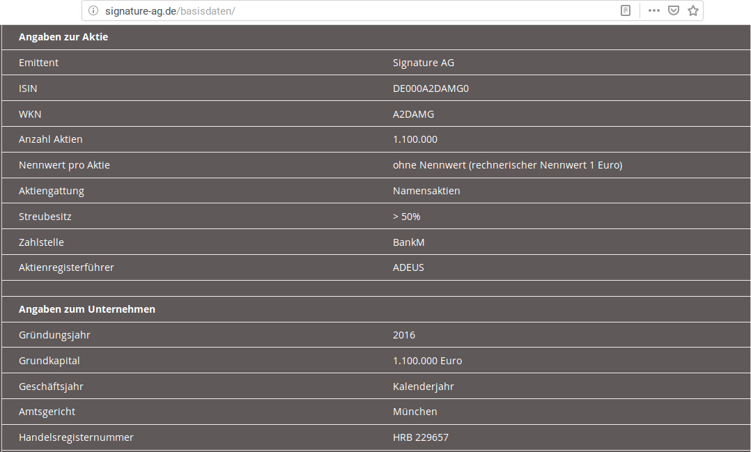 Dass die vorgenannten Vorwürfe zu einem nicht funktionsfähigen Geschäftsmodell führen ist weder logisch noch haltbar. Hieraus den Unternehmenswert von zuvor 3.300.000 Euro auf 330.000 Euro zu senken ist nicht nur fragwürdig, sondern manipulativ und schadhaft für die knapp 300 Aktionäre der Signature AG. Daher wird der Vorstand rechtliche Schritte gegen das Researchhaus und Peter-Thilo Hasler persönlich einleiten.