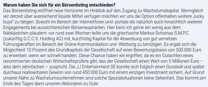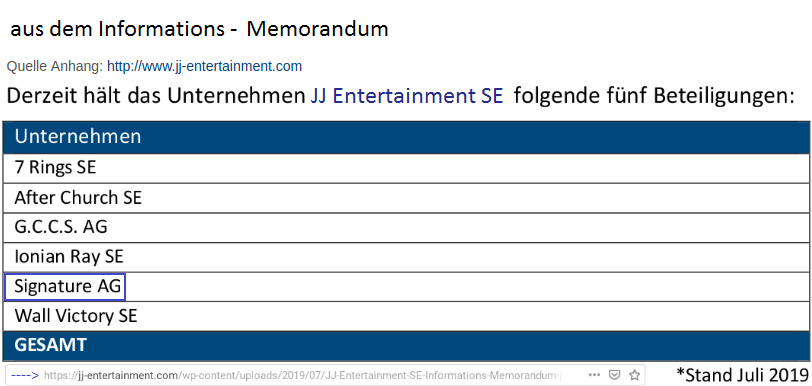 In Bezug auf die JJ Entertainment SE wurde die Kooperation beendet. Dies lässt sich unter anderem aus dem Aktionärsbrief vom 28. Juni 2020 ableiten, in dem berichtet wird, dass sich "ausgewählte Tochtergesellschaften der Signature AG zukünftig gezielt an Börsenaspiranten beteiligen". Dies kam zuvor nur der JJ Entertainment SE zu Gute. Ferner hat die Signature AG mittlerweile selber Zugriff auf Vorratsgesellschaften und muss auch hier keinen Umsatz mehr mit Drittanbietern teilen. Schließlich hat die Capital Lounge GmbH die JJ Entertainment SE auf Rückzahlung des am 05. Februar 2020 gewährten Darlehens in Höhe von 50.000 Euro verklagt, da sich diese bisher weigert, das Ende März 2021 zur Rückzahlung fällige Darlehen zu begleichen. Ob dies aus Zahlungsschwierigkeiten der JJ Entertainment SE resultiert, muss geprüft werden.