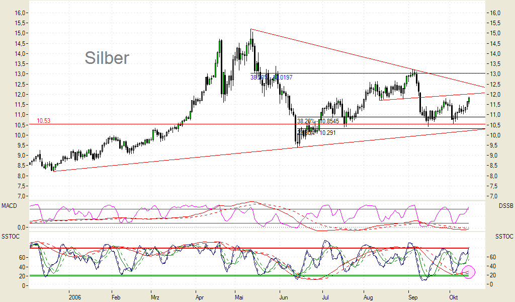 As of this writing, projected high timing is due ideally the week beginning October 9th. The next projected low timing is due the week beginning November 6th, and again, the week beginning January 8th, of 2007. (Same as the 26 week cycle low for Silver). Platinum projects a major low for the month of March in 2007.