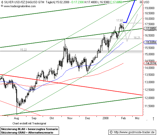 Es wird seitens des Mainstream, z.B. Wirtschaftswoche letzte Ausgabe ( Titelbild mit Goldbarren aufgemauerte Wand statt mit Ziegelsteinen ) oder 3 sat Boerse zuviel positives gleichzeitig über Rohstoffe und vor allem Gold berichtet. Also Anleger förmlich hineingetrieben...Viele schreiben , wie viel Gold ins Depot muss, ( mit Ausnahme Silber, hier ist fast nichts zu finden, also Kaufzeit weiterhin, ich warte aber ach hier auf grosse Korrektur, die in einigen Tagen , Wochen einsetzen wird )