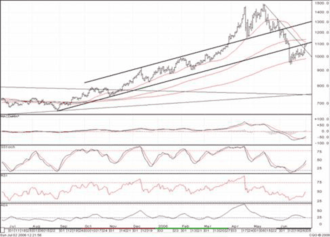 Die Zinsstrukturkurve invertierte und nahm den S&P bis zum April 2003 bis auf 800 Punkte mit nach unten, die kurzfristigen Zinsen standen dann bei 1%. Gut zu erkennen ist, dass die Zinsen rutschten, noch bevor die Wirtschaftdaten richtig nachgaben. Sobald die wichtigen Aktienmärkte einknickten, hat die FED auf Notfallprogramm umgeschaltet. Ende Mai 2006 ist zu erkennen dass mit dem nächsten Zinsschritt die Kurve wieder nach hinten fällt. Panikverkäufe gab es schon und sollte die Geschichte einen Anhaltpunkt geben, dann wird, wenn es ernst wird, die FED die Richtung ändern oder zumindest die Zinserhöhungen stoppen, dann könnte eine Kursexplosion bei Rohstoffen, Metallen und am Aktienmarkt allgemein stattfinden.