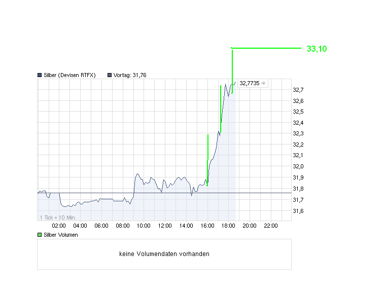 XAG in den Korb gelegt. Jetzt sollten die 33$ schnell kommen. Sell-Orders wird es dort nicht viele geben, da niemand diese Levels programmiert haben wird in den letzten Stunden.