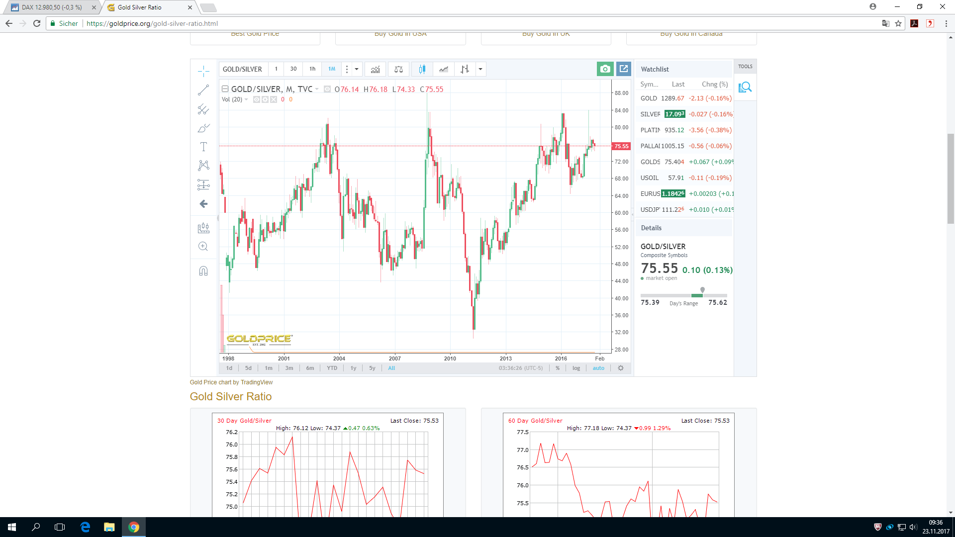 Egal, ob der Silberpreis nun einigermaßen kontinuierlich steigen oder es vorher noch einmal einen kurzen Einbruch Richtung 16$ geben sollte: Ich gehe weiterhin davon aus, dass in den nächsten 1-2 Jahren eine neue spekulative Megablase beim Silber bevorsteht, wahrscheinlich noch stärker als 2011. Neben den Gold- und Silbercharts selbst mit ihren auffallenden Parallelen zu den Jahren vor 2011 sehe ich auch die Entwicklung der Gold-Silber-Ratio als starkes Indiz dafür. Man betrachte den Chart der Gold-Silber-Ratio und beachte die große Ähnlichkeit der aktuellen Entwicklung zu der 2008-11: Anfang 2008 hatte die Gold-Silber-Ratio einen Spitzenwert von knapp 80 erreicht. Darauf folgte eine erste Korrektur bis auf 60,6 im Herbst 2009. Dann gab es Anfang 2010 wieder einen Anstieg bis knapp 68 - und dann begann die massive Korrektur von 2010/11, die die Gold-Silber-Ratio bis etwa 30 drückte und den Silberpreis auf knapp 50$ explodieren ließ. Heute kann man ein sehr ähnliches Muster sehen: Anfang 2016 ein Spitzenwert der Gold-Silber-Ratio von 83. Dann bis Sommer 2016 eine erste kleine Korrektur auf 66,5 mit einem Hochschnellen des Silberpreises von 14$ auf 21$. Dann wieder Anstieg der Gold-Silber-Ratio bis auf knapp 77 im Juli 2017. Seitdem sinkt beginnt die Gold-Silber-Ratio in kleinen Schüben wieder zu sinken. Meines Erachtens ist das der Beginn einer massiven Korrektur, die - da das Ausgangsniveau diesmal höher als vor 2011 ist - noch heftiger ausfallen dürfte und die Gold-Silber-Ratio vielleicht kurzfristig unter 30 drücken könnte. Ich glaube, wir stehen heute ungefähr dort, wo wir im Frühjahr 2010 standen.