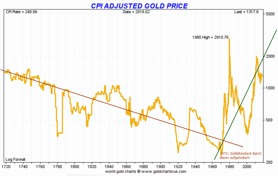 Bei ca. $1000 im Gold liegt die Kaufkraft, die Gold vor ca. 150 Jahren auch hatte, also wäre nicht besonders teuer. Im Jahr 1980 war Gold extrem teuer und im Jahr 2000 wieder extrem billig gewesen. Natürlich kann man auch argumentieren, dass Gold noch 10 Jahre im Bereich von $1000 verharren könnte. Das kann niemand ausschließen, falls die Fed alles "perfekt" kontrollieren kann. Deshalb sollte man diesen langen Zeithorizont haben!