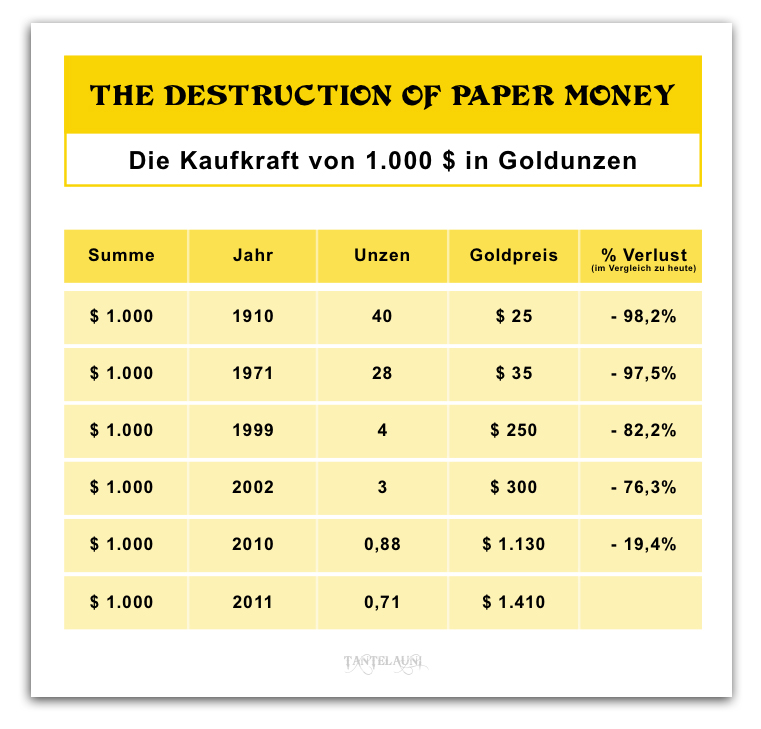 - seit 1910 hat der Dollar über 98% an Kaufkraft verloren