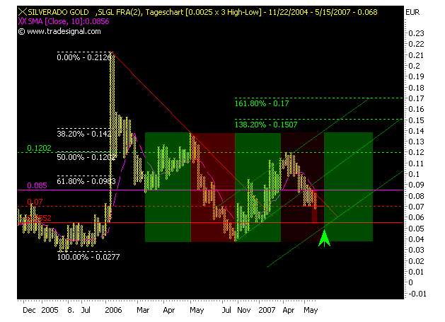 Bottomline: I believe the daily chart is showing that the downward action in price is running out of steam. However, the price must hold and rebound soon, because a break below .09 would suggest even lower prices and perhaps a bear market, instead of a bull market correction. The action for the next couple of days should give us a clue which way the price will go. My current thought is that we will see a SLGLF rebound in daily price action soon, but that it may just be a technical rebound and then we will see prices go lower – as the Weekly chart is suggesting could happen. Some bullish news out of SLGLF headquarters would probably be a good thing right now, and if it doesn’t come soon, then I doubt we will see much upward momentum.