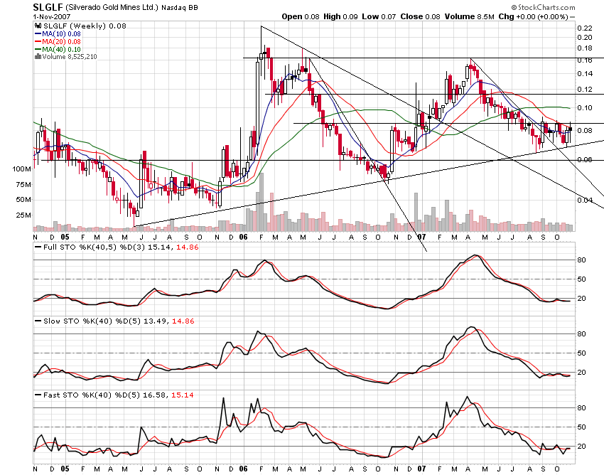 Silverado (OTCBB - SLGLF) had a good run when it surged more than 220% last October from $0.049 to $0.157 in April 2007. It then spent the next five months jigging lower before putting in a bottom of $0.067 in August. Since then however, the stock has been pushing slowly but steadily higher.