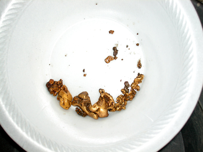 Periodic scans with a metal detector of the bedrock and gravel interface have produced an impressive array of placer gold ranging in size from small gold grains or fines, to gold nuggets weighing up to nearly 2/3rds of a troy ounce apiece.