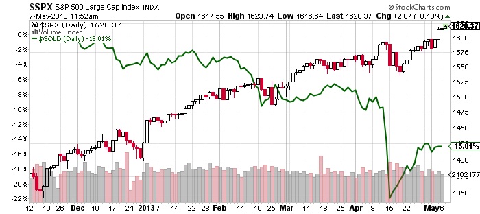 The chart below shows the relationship between gold (indicated by the green line) and the S&P 500 (indicated by the candlestick formation) since November 2012. Notice the downward bias in the precious metal at a time when the S&P 500 was moving higher toward a new record...""