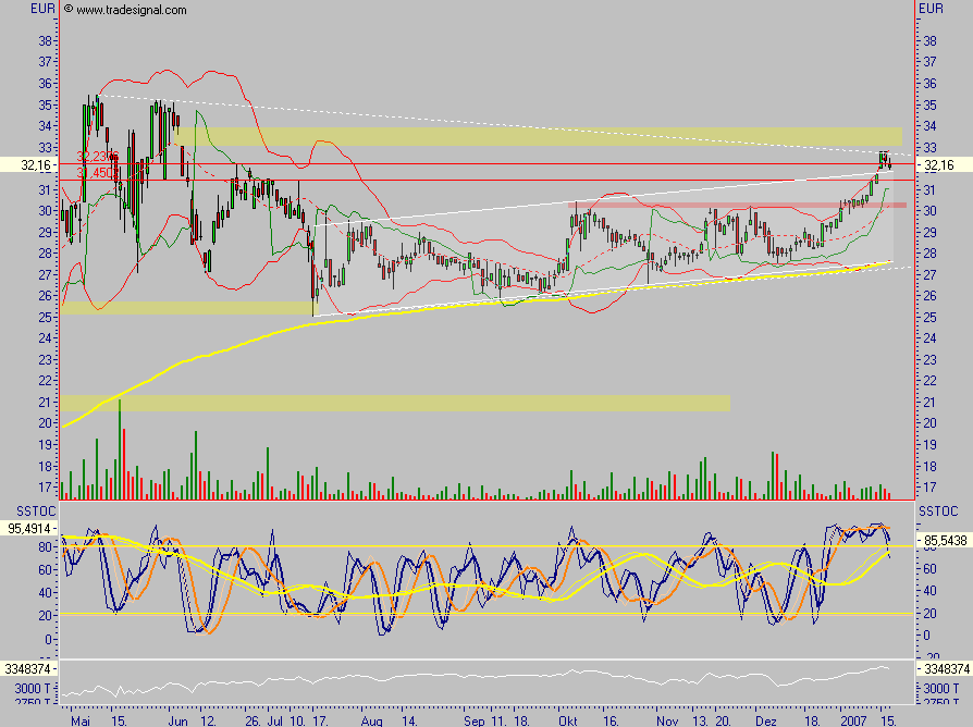 Einen eindrucksvollen Beleg dafür, welche Bedeutung gleitende Durchschnittslinien haben können, liefert derzeit die Aktie von Sixt. Von ihrem Mehrjahreshoch im Mai 2006 bei rd. 48 Euro lief sie bis September gefährlich nahe an ihren 200-Tage-Durchschnitt heran. Seitdem scheint sie von dieser langfristigen Trendlinie "spielerisch" immer wieder abzuprallen. Schön, denn diese Kurve steigt gleichmäßig an. Die momentane charttechnische Situation ähnelt der Lage vor einem Jahr. Auch damals musste das Papier sieben Monate lang (Juli 05 bis Februar 06) eine vorangegangene Kursverdoppelung "verdauen". Wir rieten Ihnen rechtzeitig zum Kauf (+102% inkl. Dividende seit PB v. 16.1.06), die Aufnahme ins Musterdepot folgte. Ob sich die Aktie (44,77 Euro; DE0007231326) auch diesmal in nur wenigen Monaten verdoppelt? Auszuschließen wäre es nicht, denn noch immer ist der Titel gemessen an Umsatz, Cashflow und Nettogewinn nicht teuer (07er KGV 12). Altleser lassen daher (ihre jetzt steuerfreien) Gewinne weiter laufen. Neuleser können noch gestaffelt zum aktuellen Kurs und bis 43 Euro einsteigen. Stopp für alle (unverändert): 33 Euro.Diese Meldung ist der aktuellen Ausgabe der Platow Börse entnommen. Sie haben noch kein Platow-Abonnement? Kein Problem. Hier haben Sie die Möglichkeit, dies zu ändern. Kostenpflichtige Einzelausgaben (Download) erhalten Sie bei unserem Kooperationspartner Börsenkiosk.
