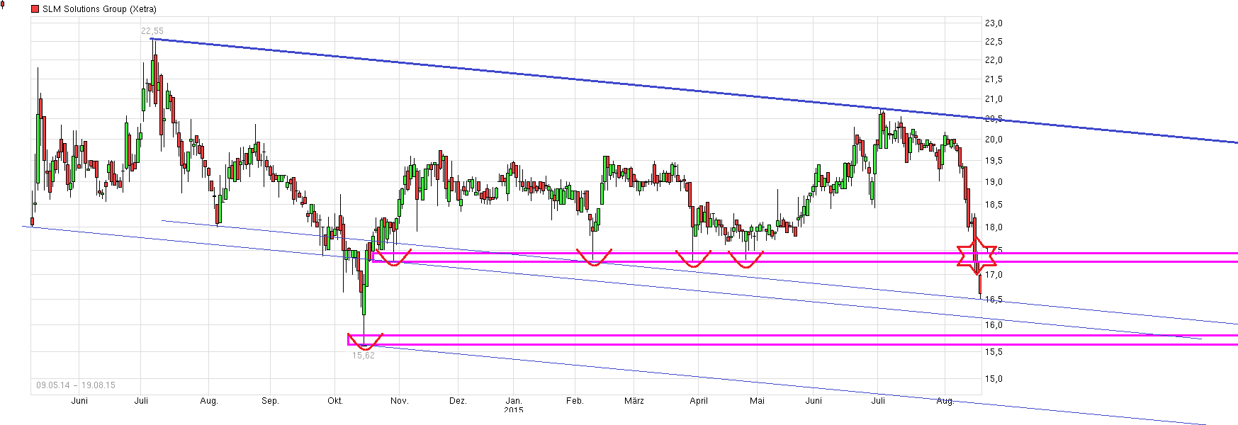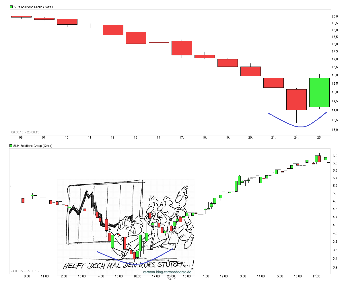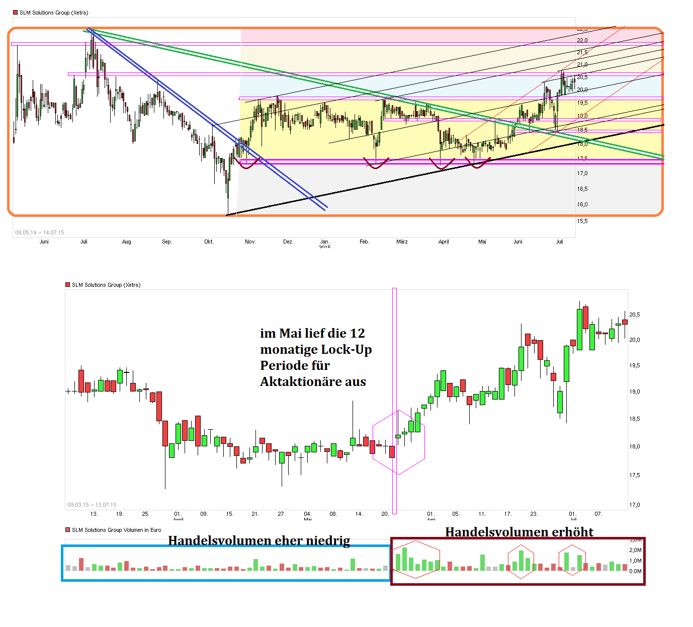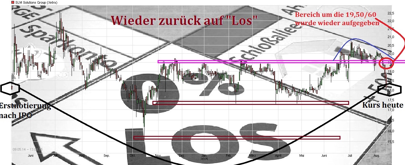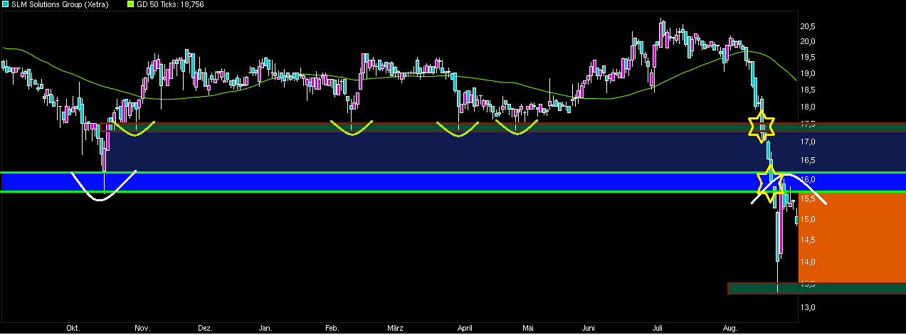 Da wäre z.B. sowas wie die Region 17,30/50 deutlich relevanter, wenn man von einer möglichen Bodenbildung sprechen möchte. Interessant ist ja besonders die große Seitwärtsrange von Oktober 2014 bis zum Juni 2015, wo man eigentlich nicht wirklich diese Region 17,30/50 - 19,40/60 in der Zeit verlassen konnte. Dann lief im Mai 2015 die 12 monatige Lock-Up Periode für die Aktaktionäre aus, zu der sie sich ja beim IPO verpflichtet hatten. Und da kam dann plötzlich ein klarer Volumenanstieg seit Ende Mai rein, der über 19,60 ging, dann jedoch nochmal den Kurs zurückfallen lies, um dann doch wieder über diese alte Range-Oberkante auszubrechen. Sieht für mich aus, als hätten da etwas größere instit. Anleger gewissen Altaktionären Material abgenommen in einer vorher definierten Preisregion. Von daher müßte man jetzt davon ausgehen, daß diese neuen Käufer vermutlich auch ein Interesse haben könnten den Kurs über ihrem EK Preis zu halten. Wenn Aktaktionäre jetzt hinreichend die Gelegenheit genutzt haben sollten sich von ungewollten Aktien nach Ende der Lock-Up Periode endlich zu trennen, dann könnte von der Seite vielleicht auch erstmal in der kommenden Zeit ein weiterer Angebotsdruck ausbleiben. Die Frage ist halt, wer jetzt die weiteren Anschlußkäufer bilden wird. Stocken nochmal Käufer weiter auf die in den letzten Wochen schon gekauft haben? Oder hofft man z.B. , daß SLM mit dem zuletzt gestiegenen Aktienkurs ( und damit erhöhtem Wert der MK und dem Wert des Free Float) und dem erhöhten Handelsvolumen vielleicht die TecDax Aufnahmekriterien leichter überspringen wird und von der Seite dann Käufer reingelockt werden durch diese Perspektive? Keine Ahnung. Denkbar ist wie immer vieles. Wichtig wäre für mich jedenfalls, daß man nicht mehr nachhaltig wieder zurückfällt unter 19,40/60. Die von dir genannten 25€ sehe ich jetzt auch nicht näher von dir erläutert. Von daher wäre das für mich erstmal auch nur eine Zahl wie viele andere auch. Interessanter wäre da schon die Marke von 22,55€. Das wäre das bisherige Allzeithoch vom letzten Jahr. Wenn es gelänge das NACHHALTIG mal irgendwann zu knacken, dann könnte das vielleicht damit nochmal technisch bedingte Anschlußkäufe anschieben und sich vielleicht dann von einer Widerstandsmarke zu einer künftigen Unterstützungsmarke umwandeln. Aber das ist noch Zukunftsmusik. Da muß man vermutlich mit den Hj1 Zahlen nochmal richtig ranklotzen, um angesichts der weiterhin schon recht sportlichen Bewertung auch fundamental weiter Holz in den Kurs-Ofen zu stecken, damit das Kurs-Feuer höher lodert ;)