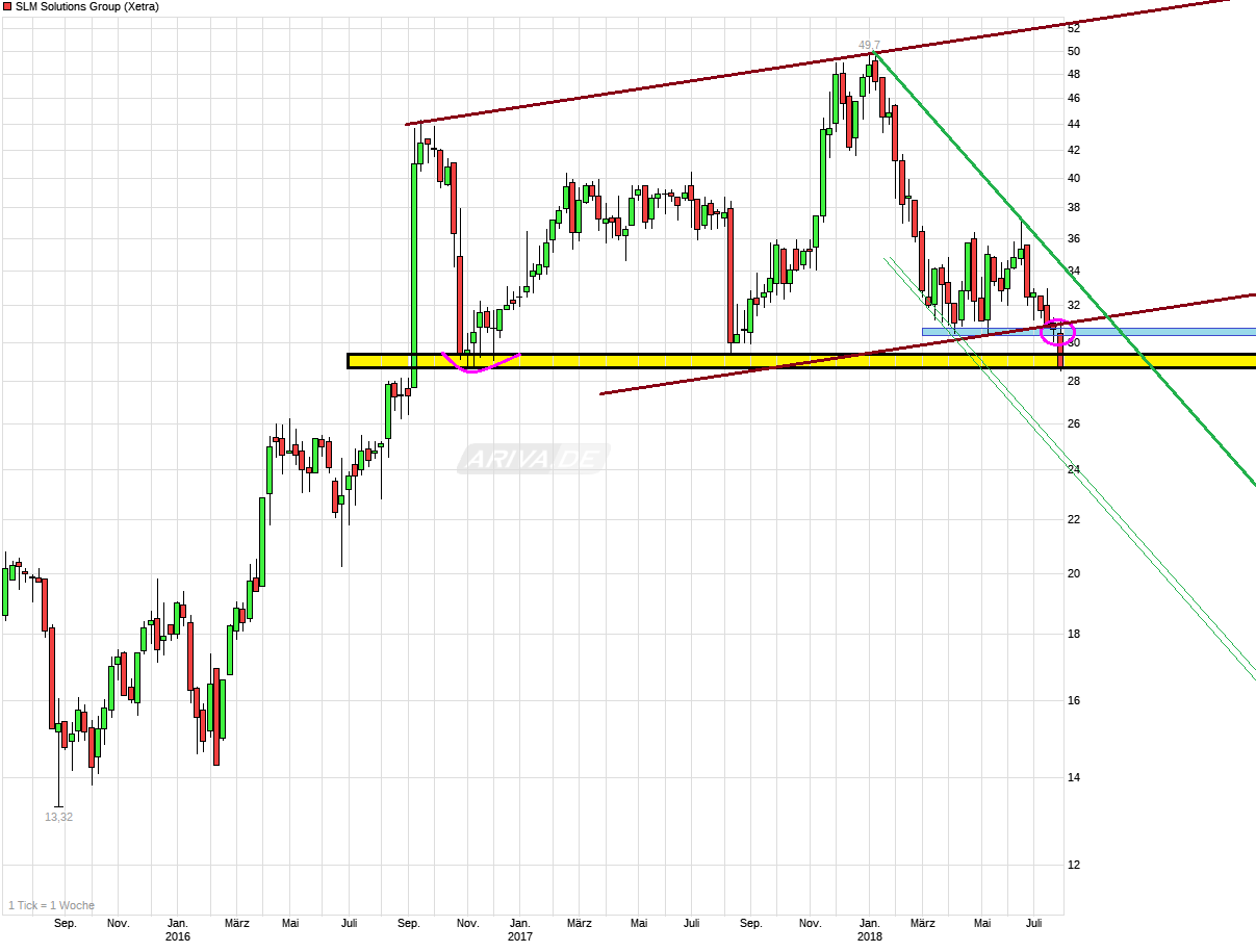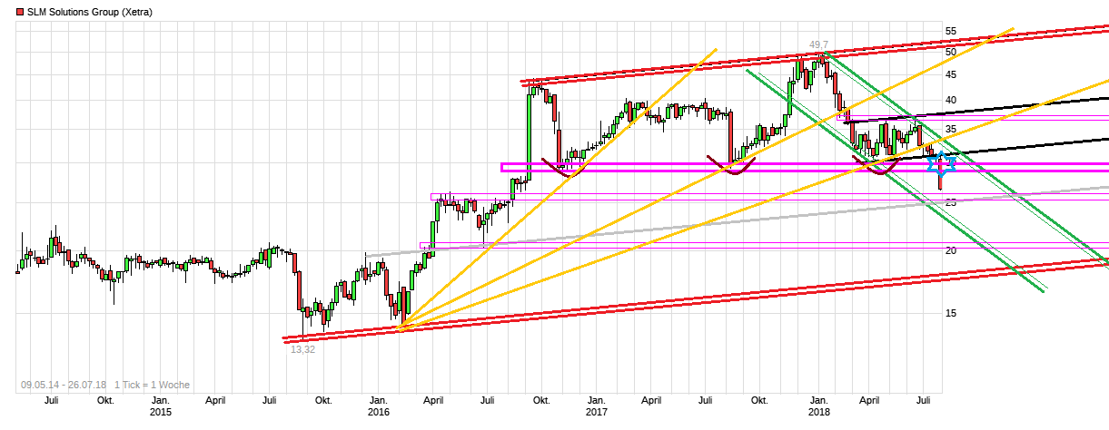 Ja, das technische Bild sieht weiterhin nicht wirklich schön aus. Heute neues Jahrestief gemacht und Abwärtstrend weiter intakt. Sollte auch noch die etwas längerfristige horizontale Unterstützung von Nov.2016 durchbrochen werden, dann dürfte eine weitere Abgabewelle folgen. Von daher mal abwarten, ob das erstmal zurückgestellt wird bis die Hj.1 Zahlen rauskommen oder ob vorher schon hier die Flinte ins Korn geworfen wird. Daher drängt sich hier aus meiner subjektiven Sicht erstmal kein Einstieg auf in dieser Situation, wo man auf eher dünnem Unterstützungseis steht. Da müßte wohl erstmal der Abwärtstrend wieder durchbrochen werden und Region von 32/33 erreicht werden, bis hier wieder etwas mehr Stabilität zu sehen wäre. Würde mich aber nicht so wirklich wundern, wenn es doch erstmal noch ein Stück weiter südwärts geht, da ich die Bewertung selbst nach den aktuellen Rücksetzern weiterhin für nicht sonderlich günstig halte. Schließt aber natürlich nicht aus, daß doch irgendwann jemand kommt der einen strategisch motivierten Aufpreis bei einem Übernahmeangebot bezahlt. Aber das ist unkalkulierbar ob und wann sowas kommt. Von daher ist es besser sich erstmal weiter mehr auf den Ist-Zustand zu fokusieren und nicht Wuschtträume zu handeln.