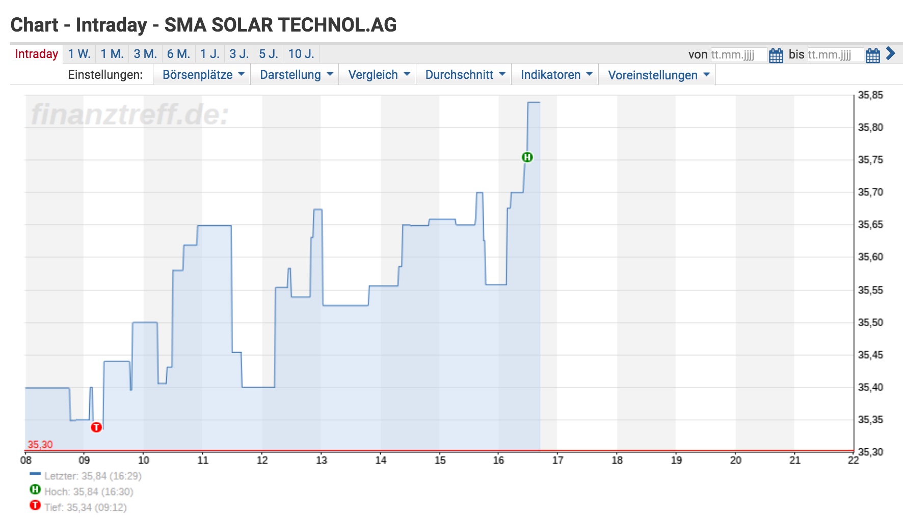 "Das heutige Minus ist nicht der Punkt, der Chart an sich zählt. Wenn die SMA Solar-Aktie die Unterstützungslinie bei 32 Euro durchbricht, ist der Bodenbildungsversuch gescheitert, der Weg zumindest mal an die bei aktuell 29,51 Euro verlaufende 200-Tage-Linie frei. Auf der Oberseite läge das vorerst rettende Ufer bei Schlusskursen über 38,50 Euro, denn dann wäre nicht nur die 20-Tage-Linie zurückerobert, sondern auch die große Kurslücke, die im Zuge der Veröffentlichung der Bilanzdaten am 9. November entstand, angegangen und könnte dann aus rein charttechnischer Sicht geschlossen werden. Heute auf das Scheitern von „Jamaika“ zu reagieren, wäre daher eine vorschnelle Reaktion, es ist schlicht offen und wir auch heute Abend weiterhin offen bleiben, in welche Richtung die Charttechnik die Aktie führen wird."
