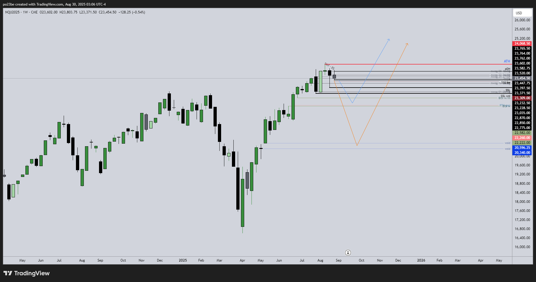 Montag ist labor day in US da wird sich nicht viel tun. Falls es einen Rücklauf zu ~23570 gibt, wäre ich wieder short interessiert oder er holt sich vorher die 23371 und dann kommt ein kleiner Rücklauf