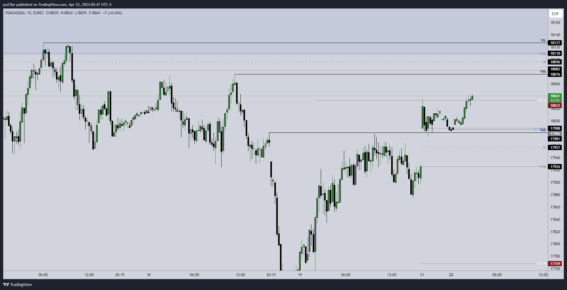 wird aber wahrscheinlich noch zum new week opening gap laufen Habe knapp über dem Hoch 18076 einen Short genommen - war risky, da keine Bestätigung. Gedanke war aber, dass darüber buystops liegen und dann runter zum gap die Richtung ist
