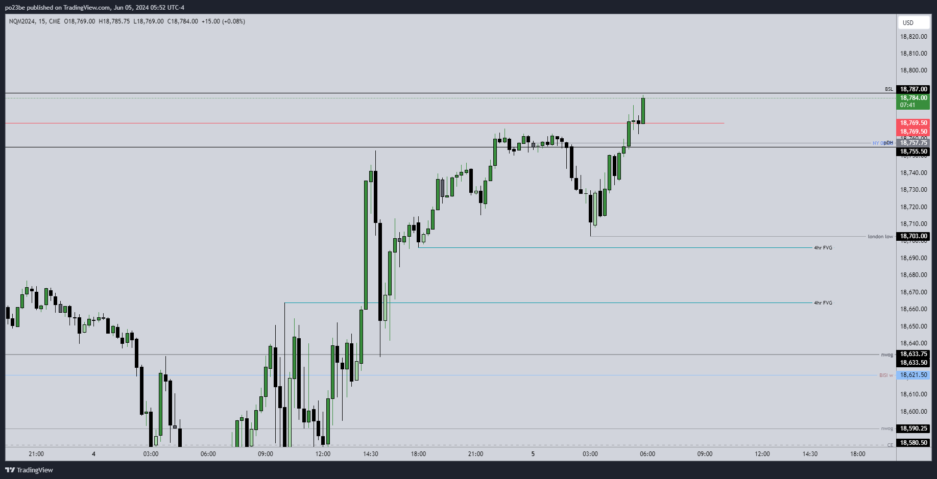 "Aber das 4hr FVG mal beobachten" Gedanke: NQ holt sich oben die BSL, is dann auch in einem daily FVG kommt dann später runter unter das london low und in das 4hr FVG - von dort dann neuer Angriff auf die Hochs