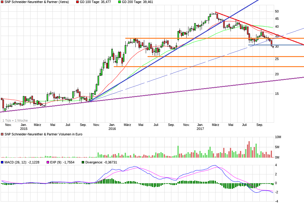 Charttechnisch sollte man sich kurz/mittelfristig allerdings möglichst erstmal auf Wochenbasis am Freitag über 31 € retten, um nicht (wie es aktuell aussieht) unten durch zu fallen und bis knapp 25,8 € durchgereicht zu werden. Da ist der Wochenschluss Freitag nach den Zahlen sehr wichtig, wenn die vor Börsenschluss kommen. Oberhalb 31 € besteht die Chance sich wieder bis 34-35 € zu erholen, wobei es erst darüber bullish werden würde. Bleibt man unter 30,6-31,0 €, siehts eher nach sinkenden Kursen aus, sowohl was Trends, horizontale Unterstützungen, gleitende Durchschnitte als auch MACD angeht.
