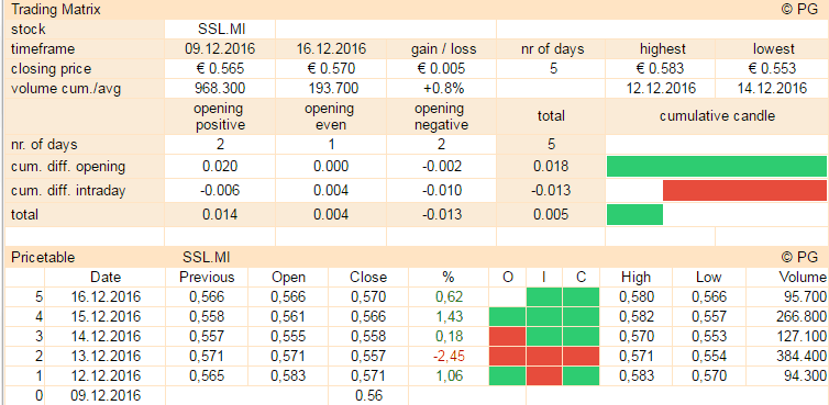 Der Kurstabelle zeigt für diese woche ein was heterogener Bild. In den letzten drei Tage gingees tagsüber hoch statt runter. Sehe grüne felder unter I. OIC=OPEN/INTRDAY/CLOSE