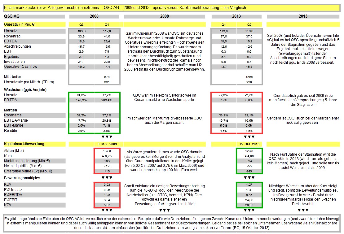 Es gibt keinerlei Beweise für deine ständigen Behauptungen bei all deinen Aktien, die wenn sie nicht steigen immer angeblich irgendwie gedeckelt werden, und aus meiner Sicht nicht mal ansatzweise Indizien. Es sind lediglich Theorien. Es gab genug andere, viel bessere Argumente, wieso die Aktien (noch) nicht gestiegen sind. Beim BVB war es genauso nachvollziehbar wie bei QSC. Beim BVB hat sich die Unterbewertung irgendwann aufgelöst, weil die Marktstellung des BVB sich stetig verbesserte und damit auch die Wahrnehmung des Finanzmarktes auf die Aktie, die dann eine höhere Bewertung zugestanden hat. Das hatte nichts mit irgendwelche imaginären Deckelungen im Orderbuch zu tun, die du bei diesen Aktien immer wahrgenommen haben willst. Und bei QSC gab es halt nie eine Unterbewertung. Daher steht die Aktie auch aus gutem Grund nach wie vor so tief.