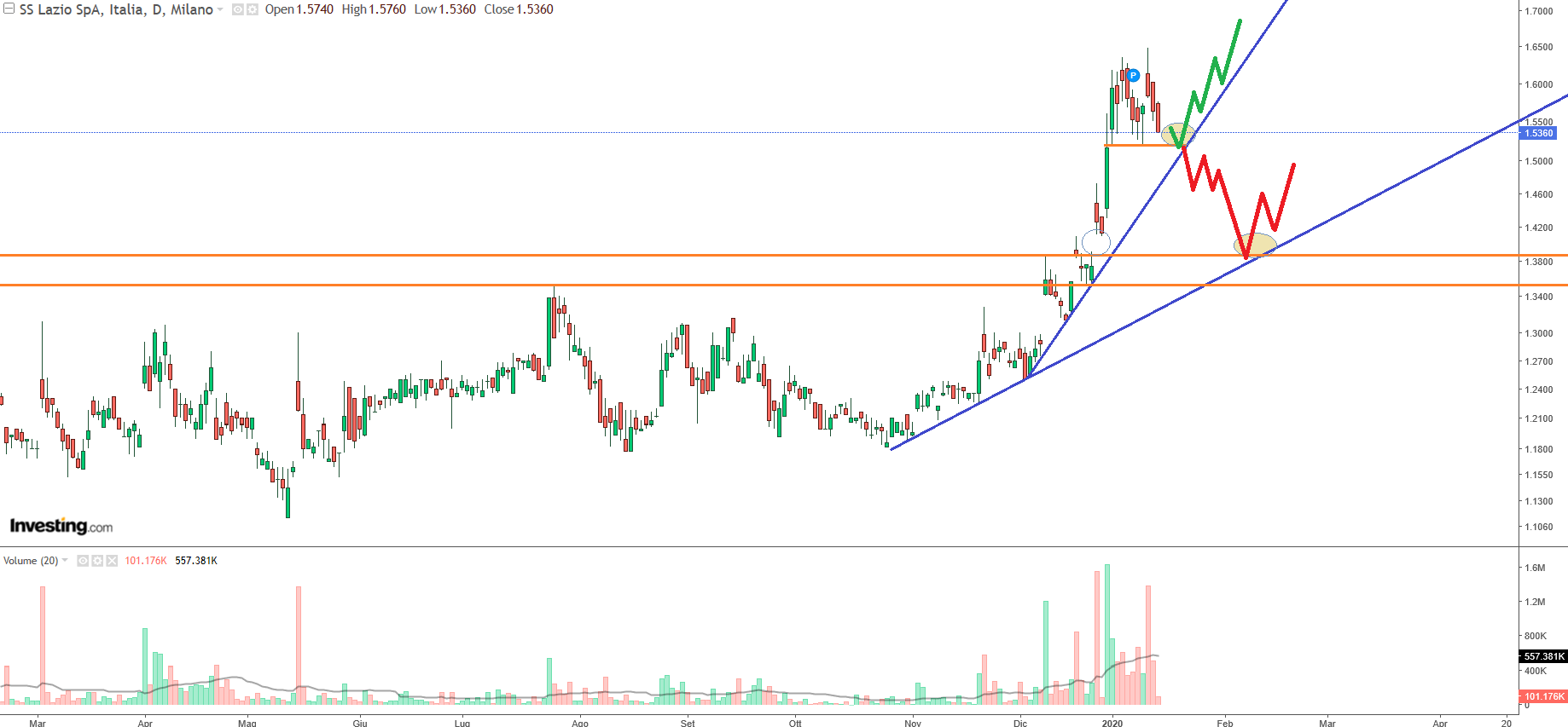 die nächsten zwei Spieltage eine gewisse Vorentscheidung bringen können, was sich dann auch im Kursverlauf/Chart (siehe unten!) bemerkbar machen dürfte. Insbesondere natürlich das Derby wird enorm wichtig, da man mit einem Sieg den Vorsprung auf Platz 5 in jedem Fall stark ausbaut und gleichzeitig noch den direkten Vergleich gegen den AS Rom gewinnen würde. Es könnten dann also inklusive Nachholspiel schon 13 Punkte Vorsprung plus direkter vergleich (also eigentlich 14 Punkte) sein. In dem Fall gehe ich davon aus, dass der Aktienkurs die 1,6 € nachhaltig knackt.