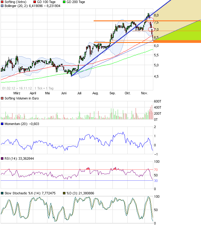 Ist doch immer das gleiche Spiel der Kulmbacher. Die suchen sich - wohlwissend um die breite und schnelle Wirkung der Empfehlung - einen marktengen Micro Cap für ihr Musterdepot aus (decken sich wie immer bei der geförtschten Scalper-Truppe vorher selbst erstmal dick ein mit dem Wert ein bevor man es verkündet) und dann trommelt Förtschs Medienkrake auf DAF, Der Aktionär Print, Der Aktionär Online, etc. laut ständig in wöchentlichen Abständen es ist alles so supidupitralla rosarot, the sky is the limit. Vor 10 Tagen zuletzt erst wieder solche haltlose Push-Trommelei : 06.11.2012 Real-Depot-Wert Softing: 8, 9, 10 … 100 Prozent, ich komme! http://www.deraktionaer.de/aktien-deutschland/real-depot-wert-softing--8--9--10---100-prozent--ich-komme--18886359.wihtm?dId=real-depot-wert-softing--8--9--10---100-prozent--ich-komme--18886359&app=310&printWithoutTeasers=true. Warum nicht gleich wieder "Dausend" ausrufen? Oder darf das der ehemalige Gebrauchtwagenverkäufer Förtsch nur selber und nicht seine angestellten Clowns? Da hat man mit dem finalen Push nochmal eine schöne Vorlage gegeben, damit die Scalper auch zu Höchstkursen noch rauskommen. Irgendwann ist so ein kleiner vorher ruhiger Wert dann plötzlich vollgepumpt von Kleingeldzockern die meistens garnicht wirklich wissen was sie da gekauft haben, aber ständig alles nachmachen was der Führer aus Kulmbach ihnen befiehlt. Das irgendwann das über Monate vollgescheuchte überkaufte Kartenhaus zusammenbricht ist daher regelmäßig der Fall beim "uneigennützigen" Musterdepot. Dann brechen die Dämme. Dann wird verkündet der Wert geht aus dem Depot raus (wobei natürlich "gewisse Leute" ;) ( = die Scalper die vor der Musterdepotaufnahme rein sind) schon kurz vorher agiert haben, um zu guten Preisen noch rauszukommen und daher schon vorher ungewöhnliche Bewegungen auftreten bevor das leichtgläubige Lemmingvolk informiert wird) und dann rennt die zuvor reingescheuchte Zockerlemmingschar wild gemeinsam wieder raus durch das enge Nadelöhr dieses Micro Caps und erzeugt dabei schnell hohe prozentual zweistellige Kurseinbrüche. Wer also regelmäßig diese geförtschten Zock-Spielchen mitmacht, der sollte nicht zu gierig werden und sich lieber rechtzeitig schonmal wieder aus derartigen Push-Werten verabschieden bevor die ganze Meute auf der Flucht alles niedertrampelt. Meistens fallen dann diese "verbrannten" Werte nach dem Panik-Sell erstmal danach wieder einen Seitwärtstrott zurück in dem sie vor der kulmbacher Push&Kill Spielchen schon waren. Von daher dürfte sich die Lage hier zwar schon bald wieder beruhigen, allerdings könnte dann die kommenden Zeit die Auswärtsdynamik wieder auf deutlich kleinerer Flamme kochen. Wer sich mit eine relativ ordentlichen Divi zufrieden gibt und nicht glaubt dieses Kulmbacher "8, 9, 10 … 100 Prozent, ich komme! " Gepushe wäre zu irgendeiner Sekunde ernst gemeint gewesen von den scalpenden Push-Clowns, der kann die Aktien weiter im Depot lassen und mal beobachten wohin wie die geflohene Lemmingherde gierig als nächstes in einen vorgekauten "… 100 Prozent, ich komme! " Kleinstwert getrieben wird von Förtschs Trommlern. Wenn man mal schaut wie die Performance dieses Musterdepots ist, dann kann man nur lachen wie blind da immer seine treue Herde nachläuft. Am Ende kommt in der Summe nichts bei rum: aktueller Stand "Veränderung seit Auflegung am 05.05.10: -10,13% , Veränderung seit 01.01.12 : +2,66%" http://www.deraktionaer.de/xist4c/web/Online-Real-Depot_id_2882_.htm