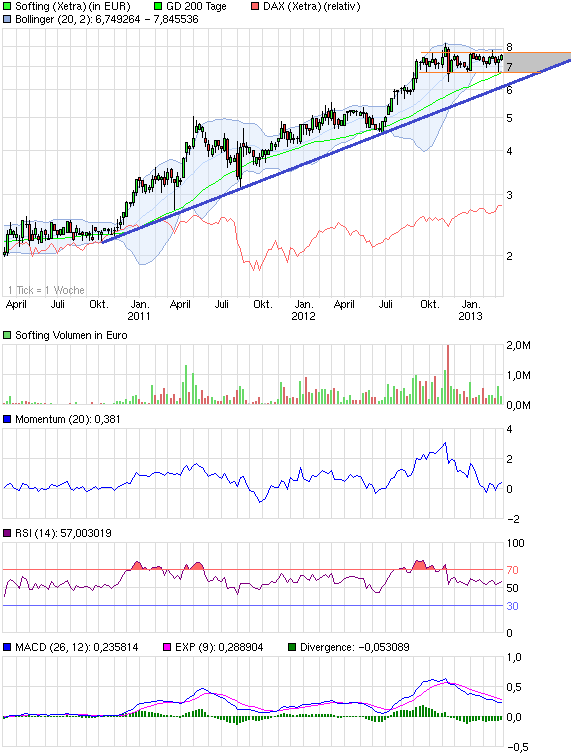 IRGENDWANN kommt wieder Euphorie an die Börsen zurück und dann wird Softing ganz andere Kurse haben, die wir uns aktuell gar nicht vorstellen können. Wenn Softing bis dahin weiter wächst, muß man sich halt mit einem KGV von 7 bis 12 zufrieden geben und kann sich zurücklehnen, attraktive Dividenden kassieren und sich über kontinuierliche Kurssteigerungen einer weiterhin unterbewerteten Aktie erfreuen.