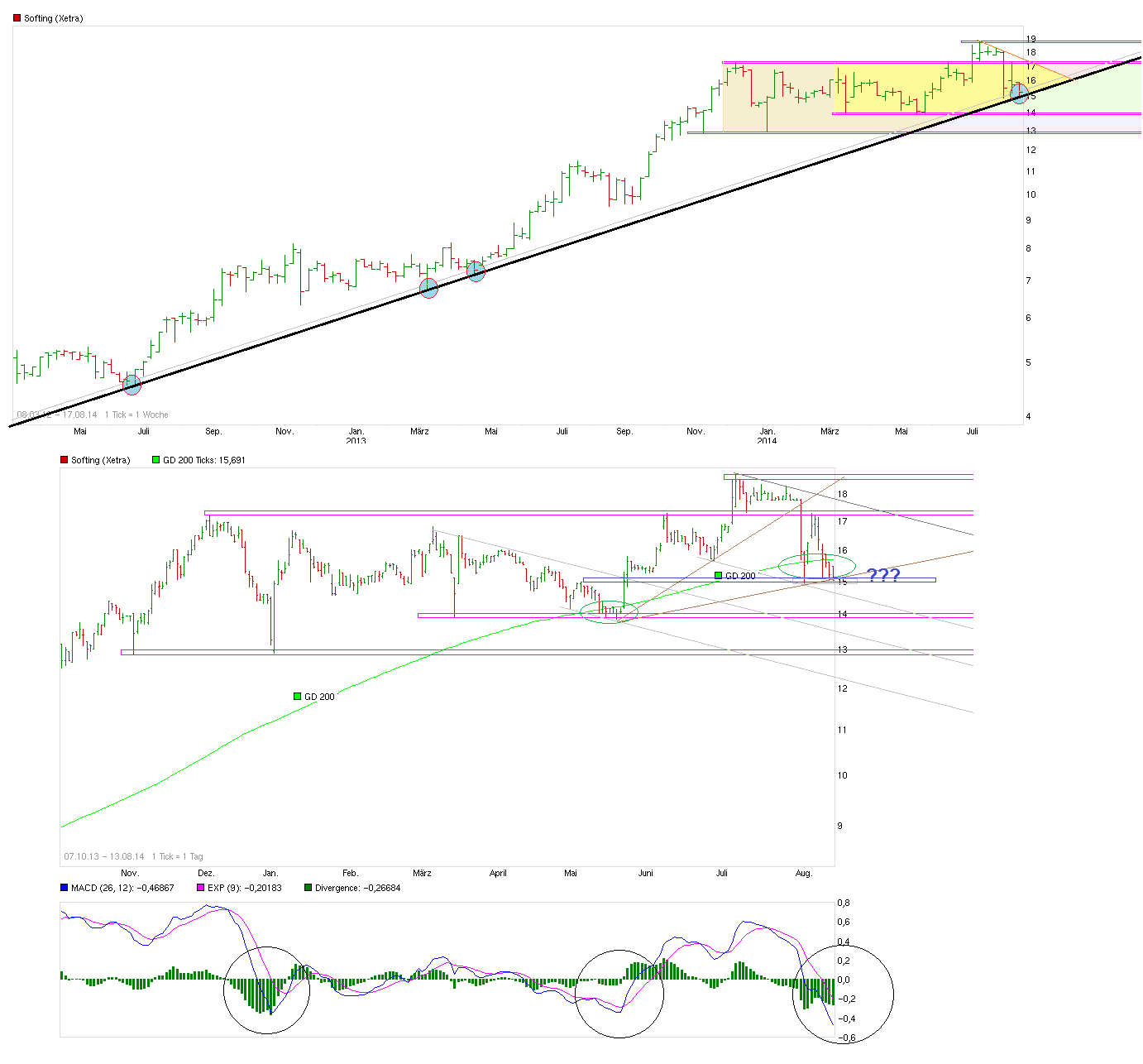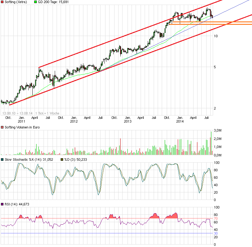 15.07.2014 - www.deraktionaer.de/aktie/...e-investoren-greifen-zu-72910.htm => Dr. Trier:"...Im Segment Automotive Electronics stehen in der zweiten Jahreshälfte einige Software- und Lizenzkäufe von Großkunden an, die zu siebenstelligen Umsätzen bei sehr guten Margen führen werden. Auch im Segment Industrial Automation stehen im weiteren Jahresverlauf interessante Abrufe für Industrieprojekte an. Beides zusammen wird im zweiten Halbjahr zu überproportionalen Ergebnissen führen, zumal die Einmal- und Aufbaukosten immer geringer werden. Wir haben durch die Zukäufe auf ein ganzes Jahr bezogen mehr als 25 Millionen Euro Umsatz hinzugewonnen, wobei wir mit der saisonalen Dynamik dieser Unternehmen noch keine Erfahrung haben. Die steuerliche Optimierung der Auslandszukäufe läuft derzeit. Allein diese Effekte in den USA können bis zu siebenstellige Auswirkungen auf das Ergebnis haben. Daher ist derzeit schlicht keine seriöse Prognose möglich. Bei Fortführung einer normalen Konjunktur sollten wir uns in 2016 dieser Marke von 100 Millionen Euro nähern oder sie bereits erreichen. Aus heutiger Sicht mit zweieinhalb Jahren Abstand würde ich für 2016 die 100 Millionen Euro Marke innerhalb eines Fensters von plus/minus fünf Millionen Euro erwarten. Klar ist aber heute schon, dass sich die Softing Gruppe mit den letzten Akquisitionen und der nun folgenden Integrationsphase in ein Unternehmen einer anderen Größenklasse entwickelt. Dazu kommt, dass wir in zwei bis drei Jahren knapp die Hälfte des Gesamtumsatzes außerhalb Europas machen werden, womit unsere Abhängigkeit von einem Markt deutlich reduziert wird. Dieses Jahr wird man aufgrund der diversen Einmalkosten von EBIT-Margen jenseits der zehn Prozent nach unten abweichen. Grundsätzlich ist unser mittelfristiges Ziel unverändert eine Annäherung an eine EBIT-Marge im Bereich von 15 Prozent. Von 2015 an sollten wir wieder zweistellige Margen bieten können. Hinzu kommen Skaleneffekte, die den Weg in Richtung 15 Prozent weiter verstärken werden...."
