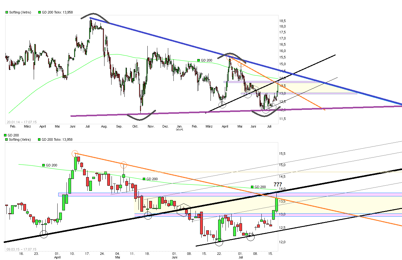 Ich bin jetzt mal gespannt was aus dieser sehr heftigen Aufwärtsbewegung vom Freitag die kommenden Tage weiter werden wird. Gab ja keine Neuigkeit (die für alle sichtbar wäre) die den Schub ausgelöst hat. Jedenfalls dürfte der Sprung über die horizontale Widerstandsregion bei ca. 13€ manchen technisch interessierten Anleger auch noch angelockt haben. Allerdings ist man dann auch schon schnell wieder an der nächsthöheren horizontalen Widerstandsregion angekommen und leicht nach unten von dort auch wieder zurückgeprallt. Gleichzeitig kam man an der schwarzen Aufw.trendlinie jetzt an, die man Anfang Juni nach unten durchbrochen hatte. Auch an dem Punkt ist man am Freitag wieder nach unten abgeprallt. Insofern ist es bislang erstmal nur ein Pullback an diese Linie gewesen. Vor der Nase liegt zudem jetzt wieder die SMA200 bei knapp unter 14€. Die letzten Versuche die SMA200 nachhaltig zu überwinden in den letzten Monaten ging ja jedesmal schief. Daher bin ich jetzt mal gespannt, ob da genug Anschlußkäufer die nächsten Tage noch kommen werden, die weiter versuchen die SMA200, die ehemalige Aufw.trendlinie und den horizontalen Widerstand zu überwinden. Eine Menge Holz die da gebündelt auf die Bullen wartet. Entsprechend wenig überrascht wäre ich, wenn man vielleicht erstmal versucht das Erreichte zu stabilisieren bevor man sich dann vielleicht wieder an einen weiter Schritt nach oben wagt. Schätze am Ende werden sowieso die Hj.1 Zahlen&Prognosen entscheiden wie langlebig die gegenwärtige Bewegung sein wird. Je weiter man vor den Hj.1 Zahlen kursmäßig anziehen würde, desto höher liegt dann natürlich auch wieder das Stöckchen über das Trier springen muß, um die Anleger weiter bei Laune zu halten. Solange man sich jetzt erstmal weiter über der 13€ halten kann, ist erstmal auf kurze Sicht die Sache garnicht so schlecht. Richtig interessant würde es natürlich, wenn es mal gelänge in den kommenden Wochen und Monaten aus dem seit Mitte 2014 fallenden Dreieck nach oben auszubrechen ( =>www.tradesignalonline.com/de/lexicon/...=Das+Fallende+Dreieck ).