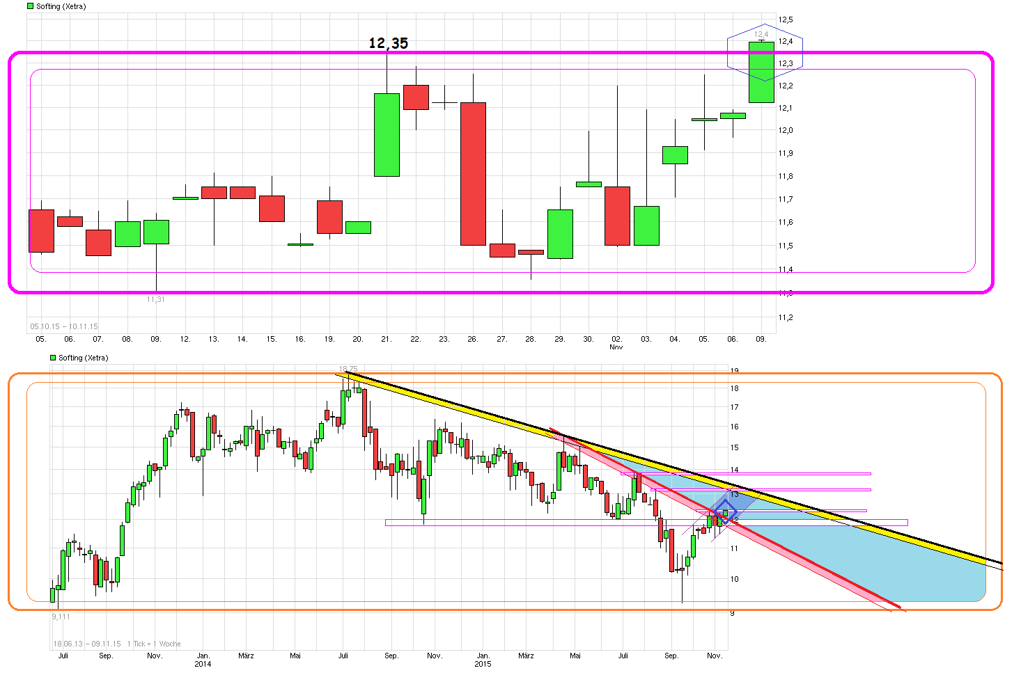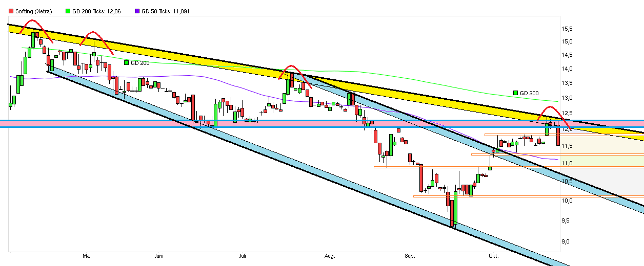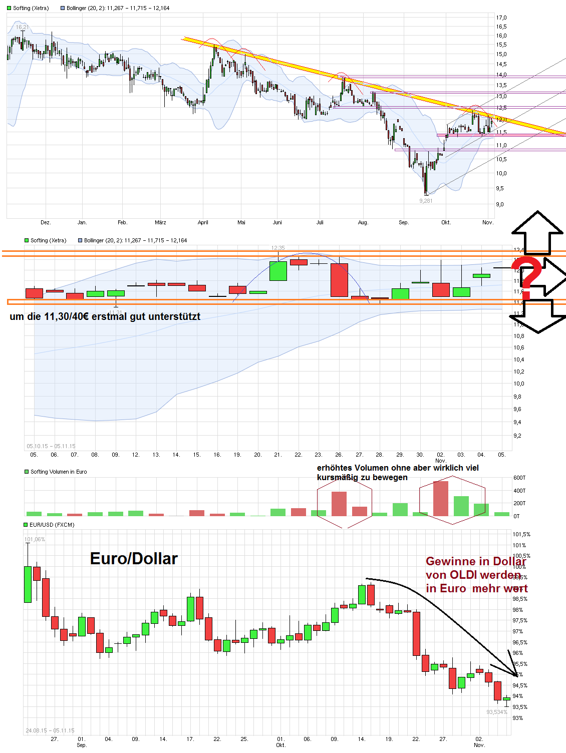 Umsätze schön und gut, aber aus der zähen Seitwärtsrange der letzten Wochen hat es den Kurs auch (bislang) nicht bringen können. Und auch der seit Frühjahr fallende Abw.trend konnte bislang (noch) nicht überwunden werden. Möglich, daß man diesen Seitwärtseiertanz noch bis zu den Zahlen am 13.11. sieht, falls nicht irgendwelche Spekulanten vor den Zahlen noch vermehrt reinhüpfen in Erwartung irgendwelcher Good News. Dann wird man ja Ende nächster Woche sehen, ob man mit Hilfe von OLDI im 3. Quartal die bescheidene Performance des 2.Q. wieder aus den Köpfen der Anleger bekommen wird. Das Stöckchen über das man springen müßte um die 15er Umsatzprognose zu erreichen ist ja nicht besonders hoch. Und die jüngste Entwicklung bei Euro/Dollar ist sicher auch nicht verkehrt für die Gewinne, da laut Trier ca. 40% der Umsätze inzwischen aus dem Dollarraum kommen und die Gewinne aus der Region umgerechnet in Euro mehr Wert bekommen, wenn der Dollar stärker wird. Sollte Yellen die US Zinsen Mitte Dezember anheben und Draghi Anfang Dezember weitere QE Maßnahmen verkünden, dann würde €/$ wohl noch weiter sinken. Bleibt zu hoffen, daß die seit langem nurnoch mäßig laufenden Europageschäfte und der Automotiv-Bereich nicht erneut als Bremsklötze vor der Kurslokomotive landen. Es sollen ja neue Generationen von Geräte im 2.Hj. eingeführt werden. Mal schauen, ob die Kunden von Softing soviel davon abnehmen wie erhofft. Im Interview unten klang Trier so, als ob man nicht genug vernünftiges Personal hätte um Projekte rechtzeitig zu stemmen. Vielleicht sollte er mal sein astronomisches Vorstandsgehalt etwas kürzen und das so eingesparte Geld dafür verwenden qualifizierte Leuten mit einem besseren Gehalt zu locken. Dann bekäme er schon die nötigen Leute.