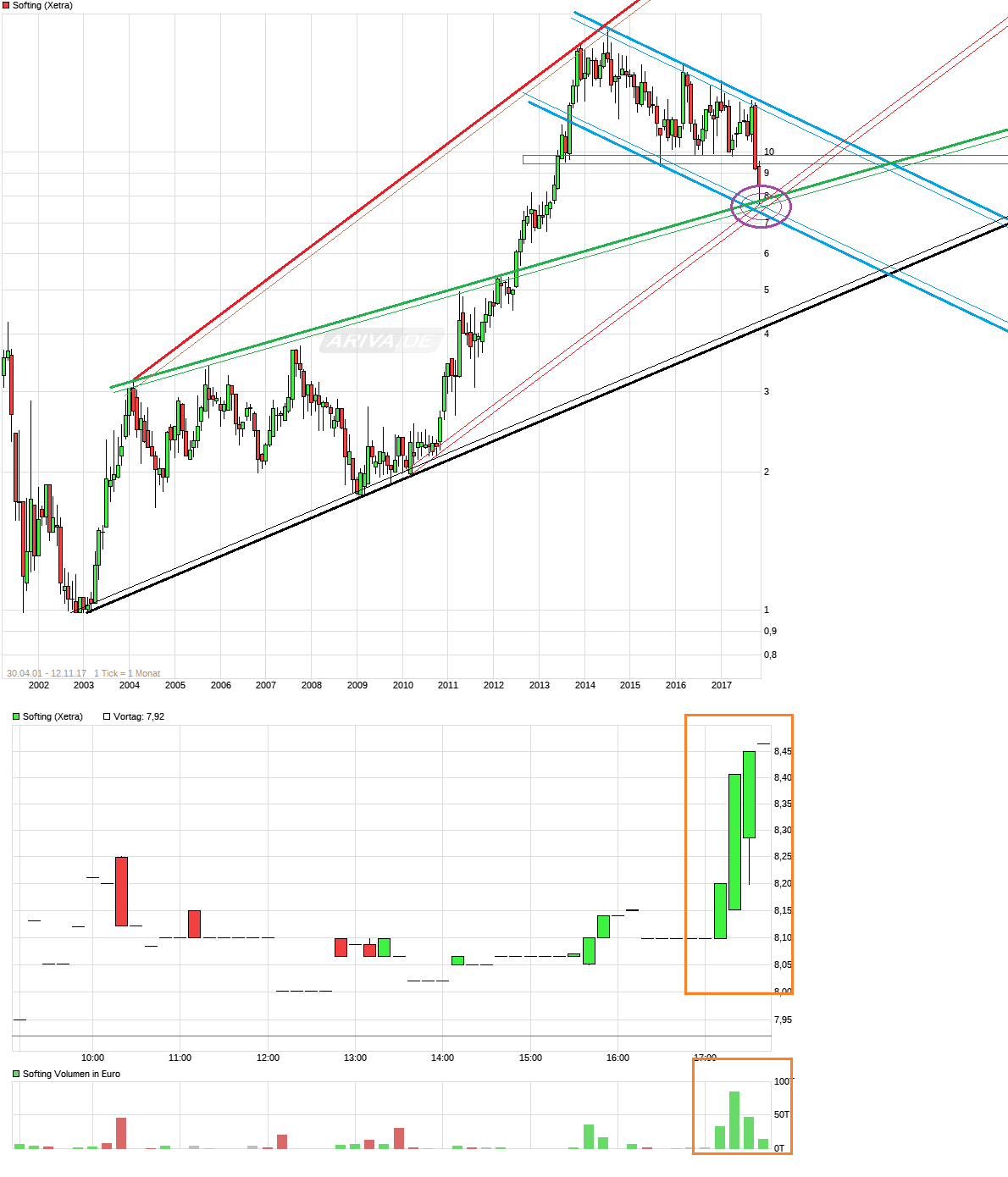 am Montag auch noch so kaufgierig ist/sind. War ja lediglich am Handelsende dieser plötzliche newslose Anstieg zu sehen während lange davor die breite Masse offenbar kein wirkliches Interesse hatte das Teil wieder weit über 8€ zu kaufen. Hat also nur eine einzelne Person gekauft? Was ist, wenn diese Person wieder fertig wäre mit Zukäufen? Geht man dann wieder an der 8er Marke zurück? Oder deckte sich ein Leerverkäufer etwas ein? Wie dem auch sei, es wäre nicht wirklich überraschend, wenn es nach den deutlichen Kursreaktionen nach unten dann im Bereich um 7,50/8,0 auch mal wieder zu gewissen technischen Gegenreaktionen käme durch spekulative Anleger. Im Bereich um die 9,50/10,00 Marke dürfte das horizontale Brett erstmal dick bleiben. Von daher sind solche Reaktionen eventuell eben auch nur von temporärer Natur bzw. aus einem reinem Tradinggedanken raus entstanden. Ein belastbares Signal einer große Bodenfindung/-bildung wäre daher nicht vorschnell schon abzuleiten. Dafür sind die fundamentalen Zahlen für 2017 doch etwas mau und die momentanen Aussagen zu 2018 hauen einen auch nicht wirklich vom Hocker. Da Trier die letzten Jahre immer bei Prognosen übertrieben hatte, dürfte seine Glaubwürdigkeit in Prognosedingen daher nun deutlich gesunken sein. Aber vielleicht hat daher Trier diesmal vor etwas Understatement mal zu betreiben und eigentlich erwartet er für 2018 doch mehr. Wäre zwar völlig gegen sein Naturell und bislang ist auch nicht wirklich zu sehen wie 2018 die große Wende bei der Marge dann bringen soll. Aber wer auf ein solches Szenario wetten möchte, daß ab 2018 doch der große Turnaround kommt, der könnte jetzt schon geneigt sein zu kaufen in niedrigen 8er Regionen, weil das Rückschlagspotenzial überschaubarer erscheint als noch kürzlich, wo man 4 - 5 € höher stand. Aber wie gesagt, man muß mal schauen ob und wie lange Anschlußkäufe überhaupt kommen zu den Käufe am Handelsende des Freitags. Könnte auch nur eine Art Frühstart gewesen sein und man läuft doch nochmal bis an die direkte Unterkante des blauen Abw.trendkanals. Und bei aller technischer Betrachtung, das beste Mittel hier wieder Leute als Käufer zu gewinnen wäre einfach stetig stärkere Zahlen künftig wieder zu bringen ( besonders beim !!organischen!! Wachstum), Prognosen regelmäßig zu erfüllen/toppen und als CEO mal etwas selbstverliebte Überheblichkeit gegen etwas mehr Demut und Realismus zu tauschen. Denn sicherlich ist neben den immer wieder zu schwachen Zahlen bei Softing auch der CEO und Großaktionär Trier längst ein kursbelastendes Problem mit seiner Art wie er auftritt gegenüber dem Kapitalmarkt und sich für anhaltende Minderleistung in den letzten Jahren die Vorstandstaschen immer krasser vollgestopft hat mittels seiner allesabnickenden handverlesenen AR-Marionetten.